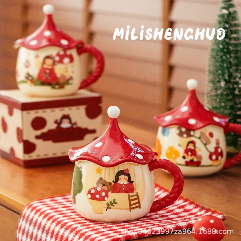 見栄えの良いカップルマジックマッシュルームガールセラミックカップ家庭用飲料カップ蓋付き見栄えの良いマグカップ女性ミルクカップ
