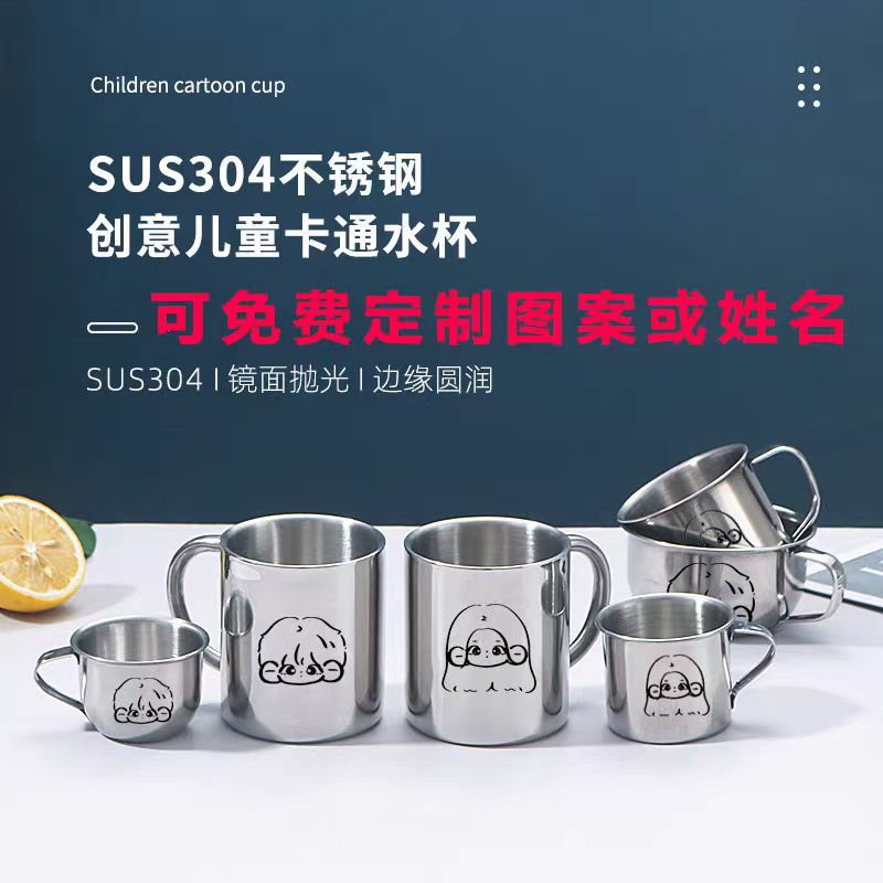 304ステンレスの口の杯の柄の厚い漫画の子供の幼稚園の赤ちゃんはコップのレーザーの小さい湯飲みのlogoを飲みます。