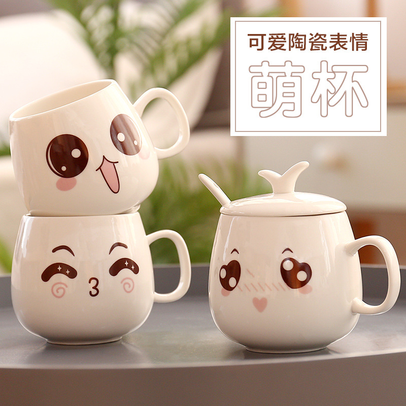 創意的で可愛い表情カップ蓋付きスプーン付き陶磁器カップファッション牛乳カップ韓国版コーヒーカップマグカップ雯沃