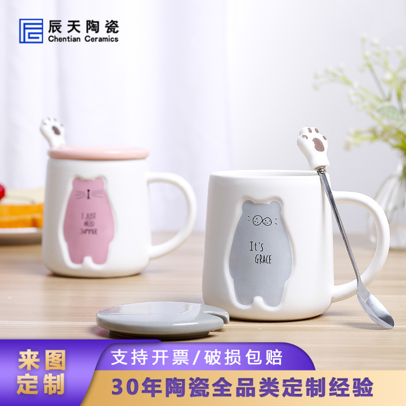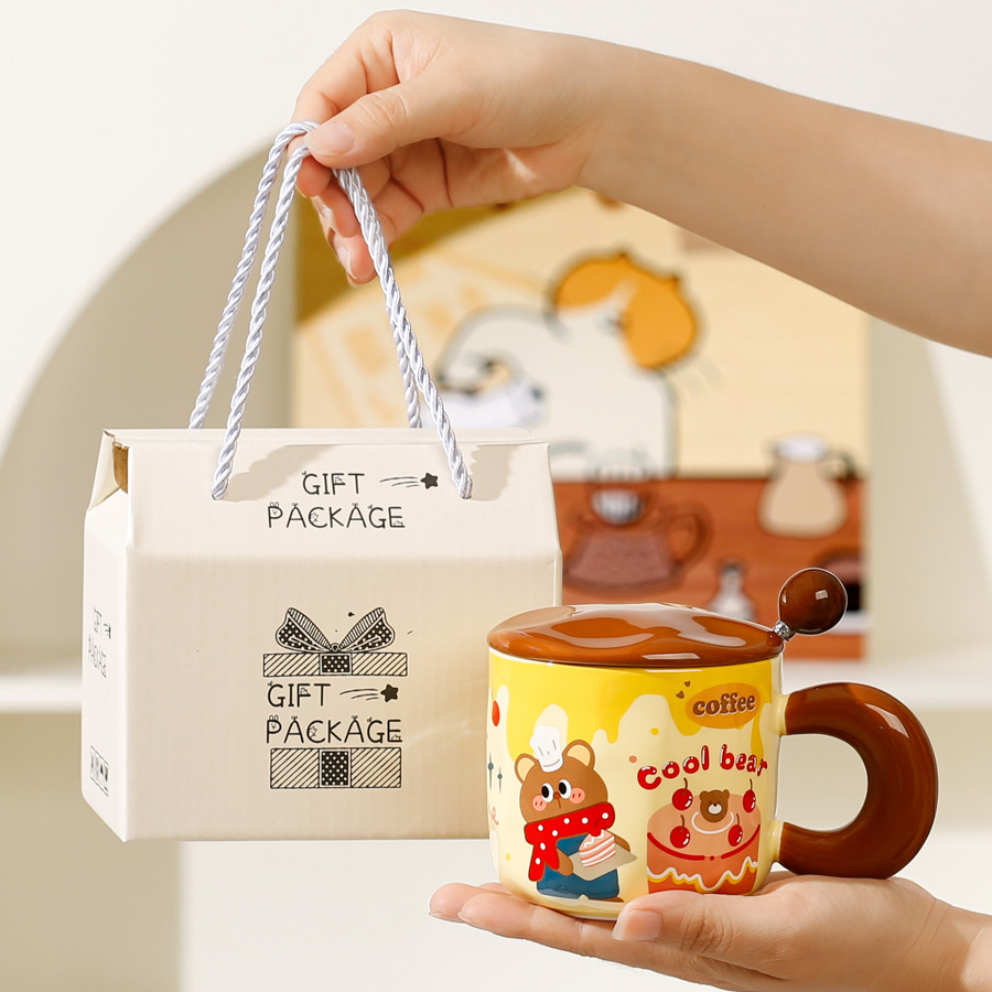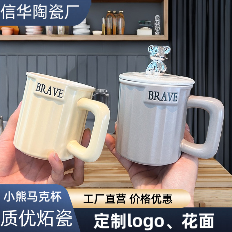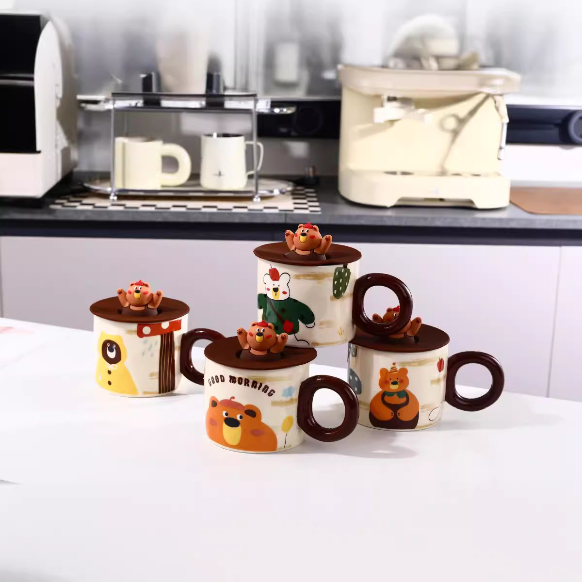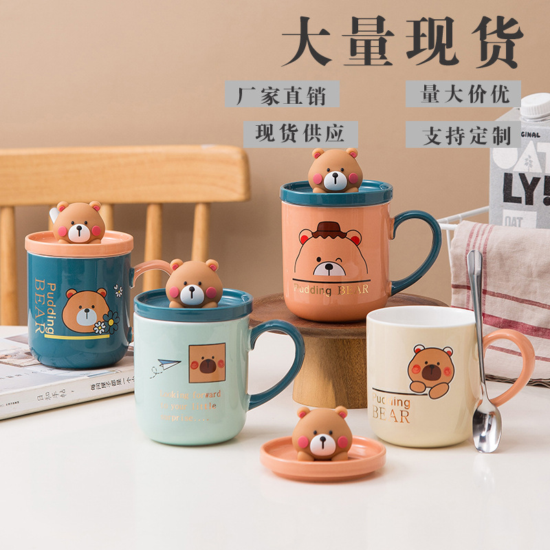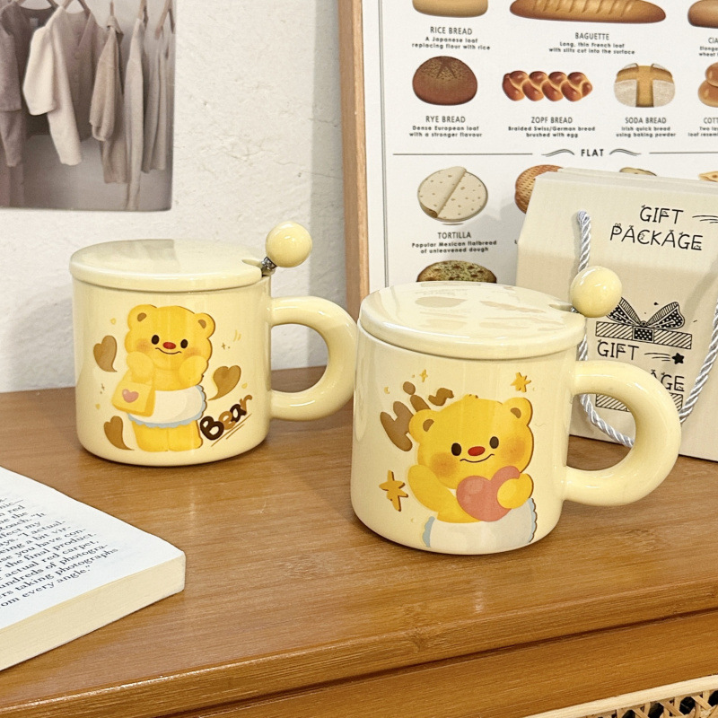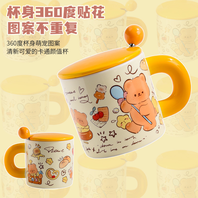 熊マグカップ陶磁器カップ蓋付きスプーンカップル高颜値家庭用陶磁器朝食カップオフィスコーヒーカップ