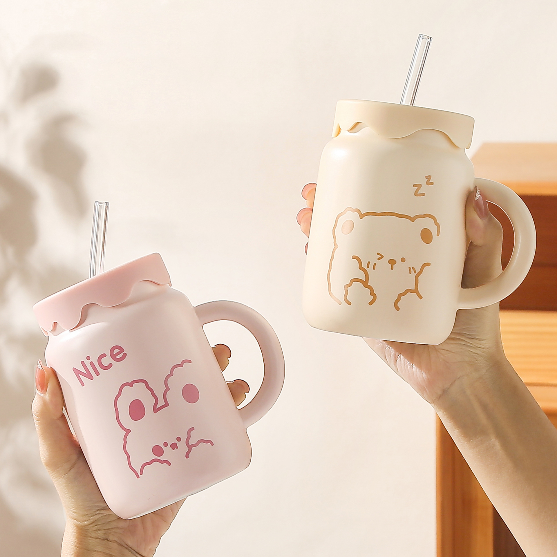 ベアーストローカップ漫画家庭用マグカップ蓋付きシンプル風飲料カップオフィスカップ大容量朝食カップ