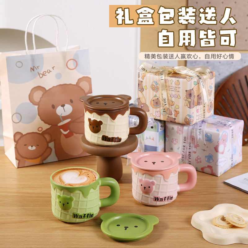 クリエイティブレリーフ陶磁器カップ手描きベアーワッフル朝食カップカップル六一子供の日お土産