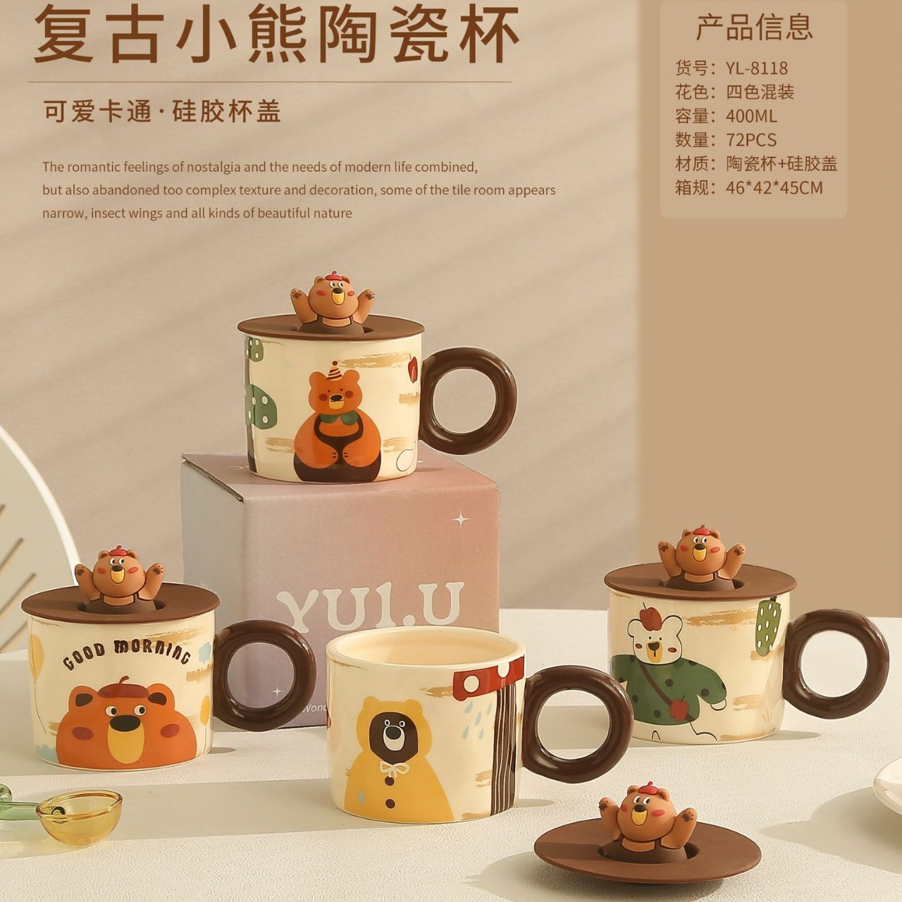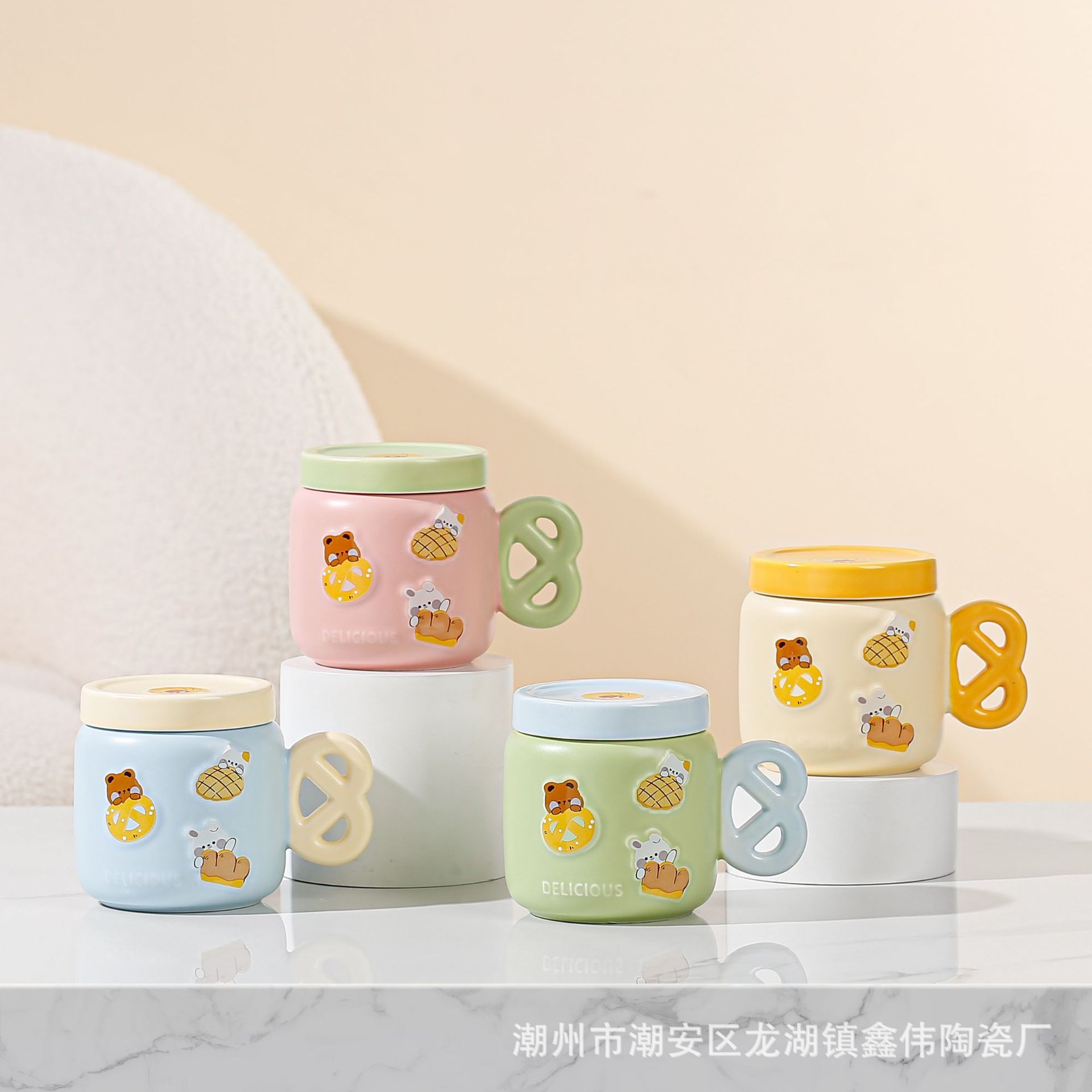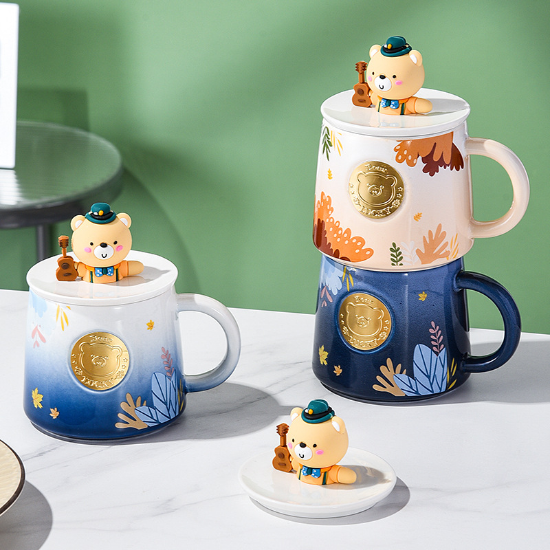 漫画セラミックカップかわいい動物マグカップ蓋付きスプーン付きベアー女子オフィスカップ学生カップロゴ