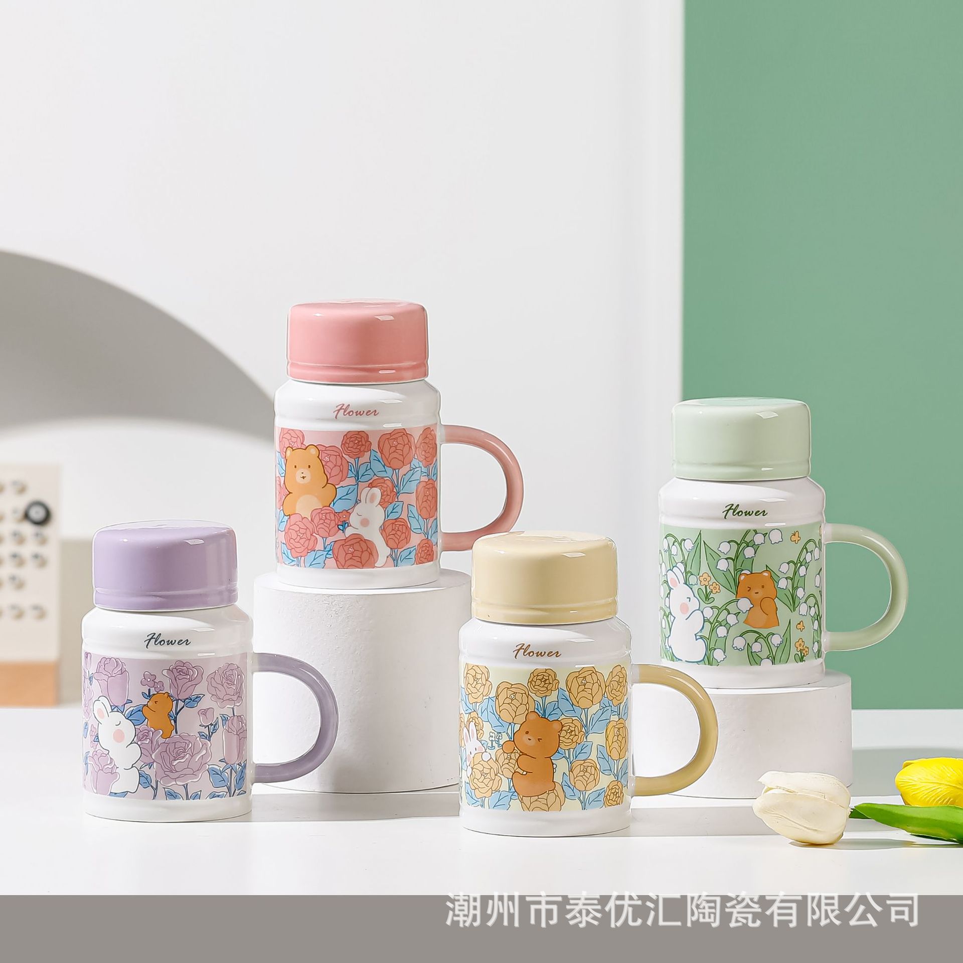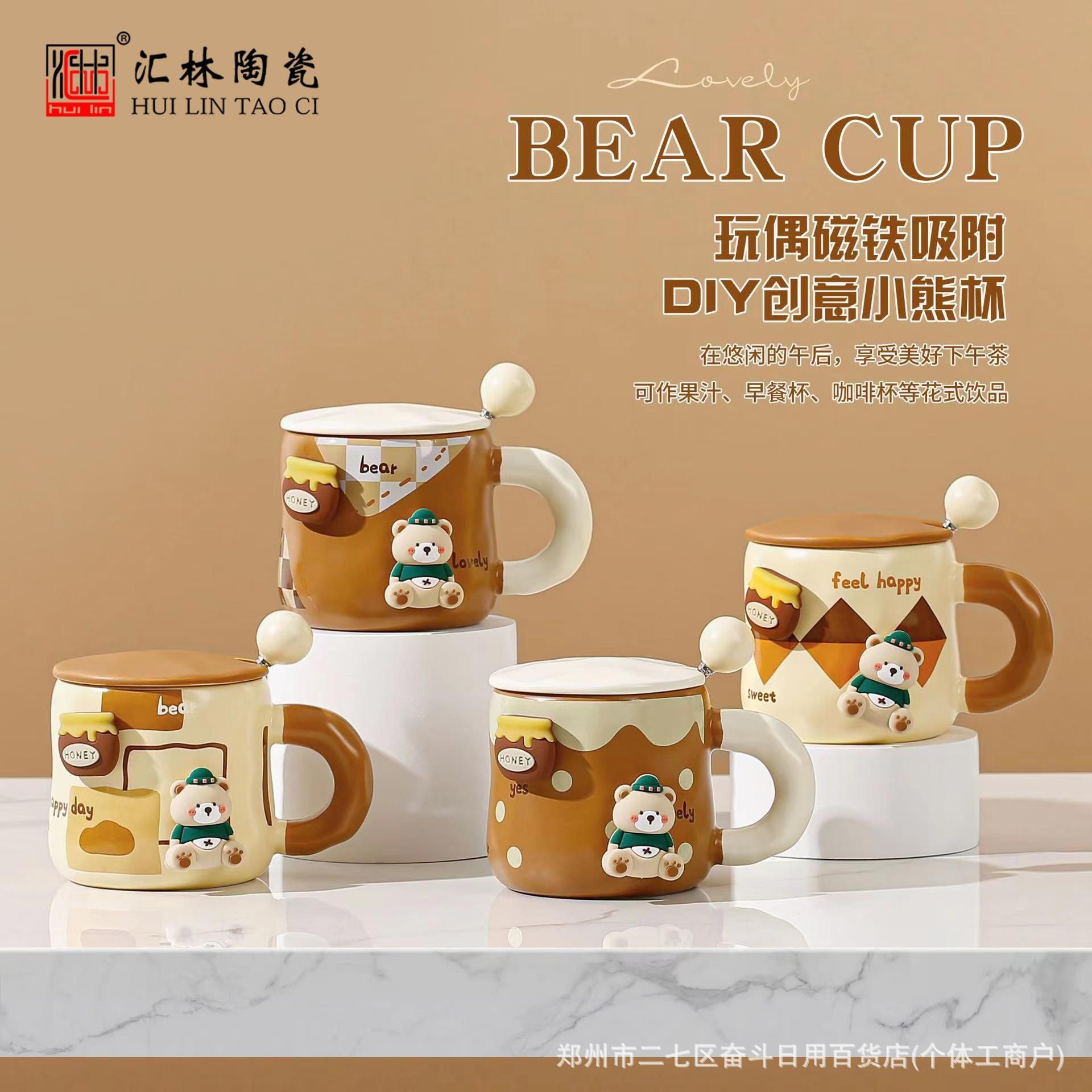 熊コップ陶磁器マグカップ蓋付きカップル高颜値家庭用コップオフィス牛乳コーヒーカップ