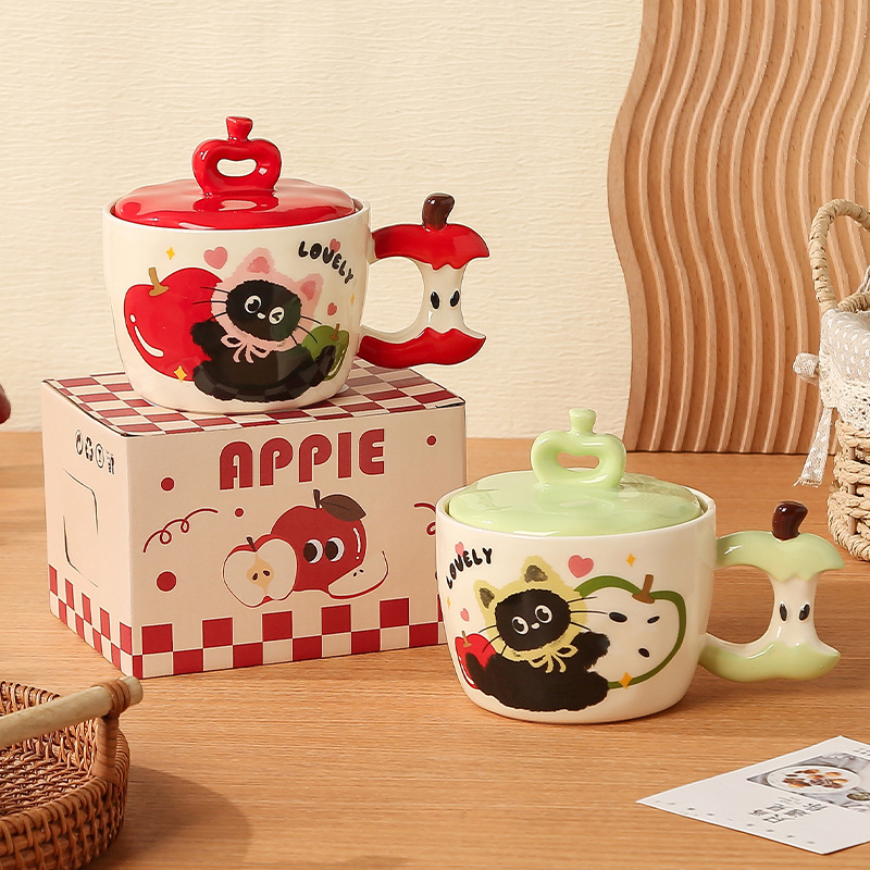 アップルの陶磁器のコップの女子学生の創意的な猫のマグカップは蓋の高い顔の価値があります。