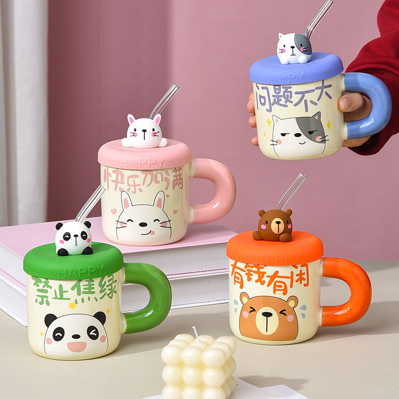 ストローママグカップ蓋付き陶磁器カップ大容量女子高颜値オフィスカップ家庭用飲水朝食カップ