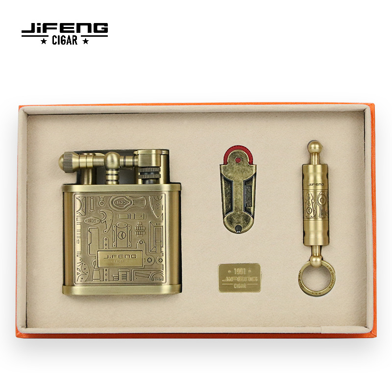 Jifeng季節風シガーライターセット金属シガードリル直充ライターと火石シガーナイフ