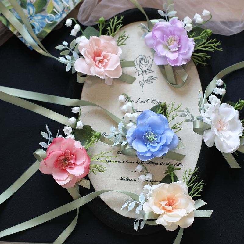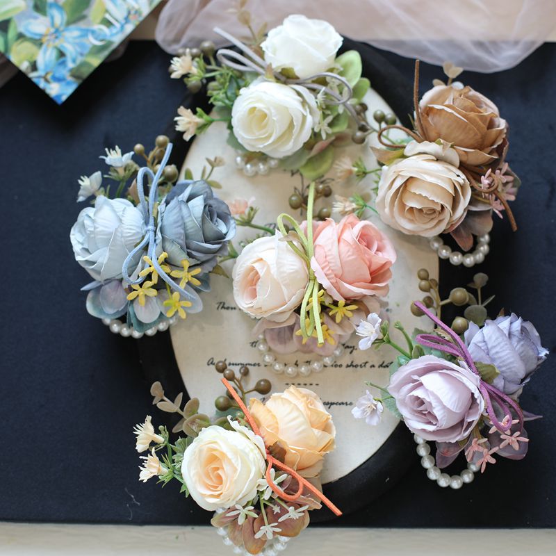 卸売美しい小さな新鮮な花嫁の手首の花ブライズメイドグループ姉妹の手の花模擬バラ韓国の結婚式の装飾花