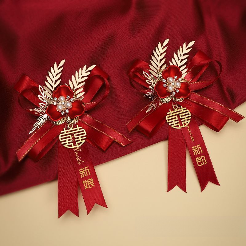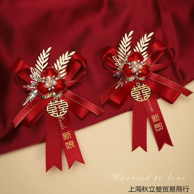 ◈ 結婚式のコサージュ卸売新郎新婦コサージュフルセットリボン両親ブライズメイドベストマンブローチ中国風襟