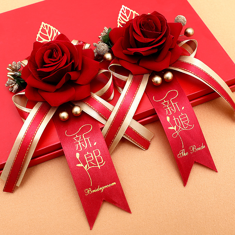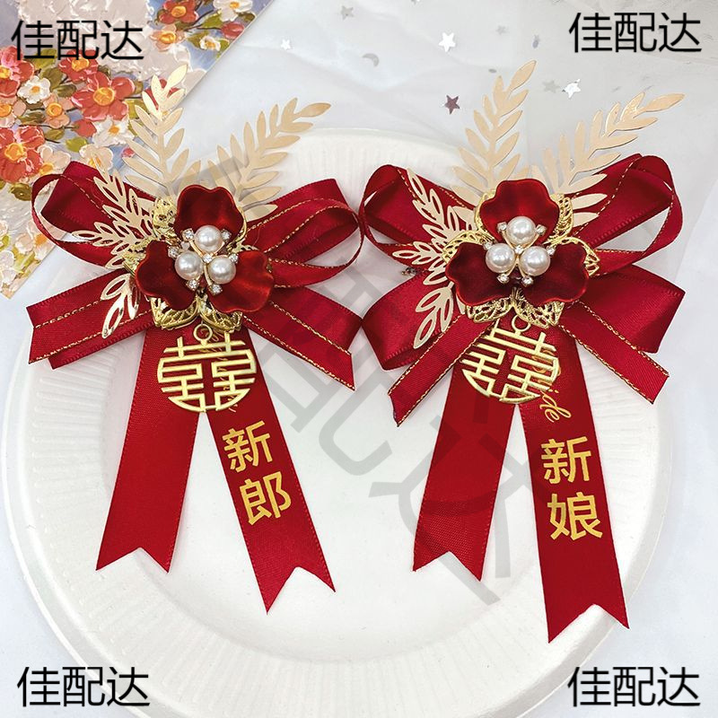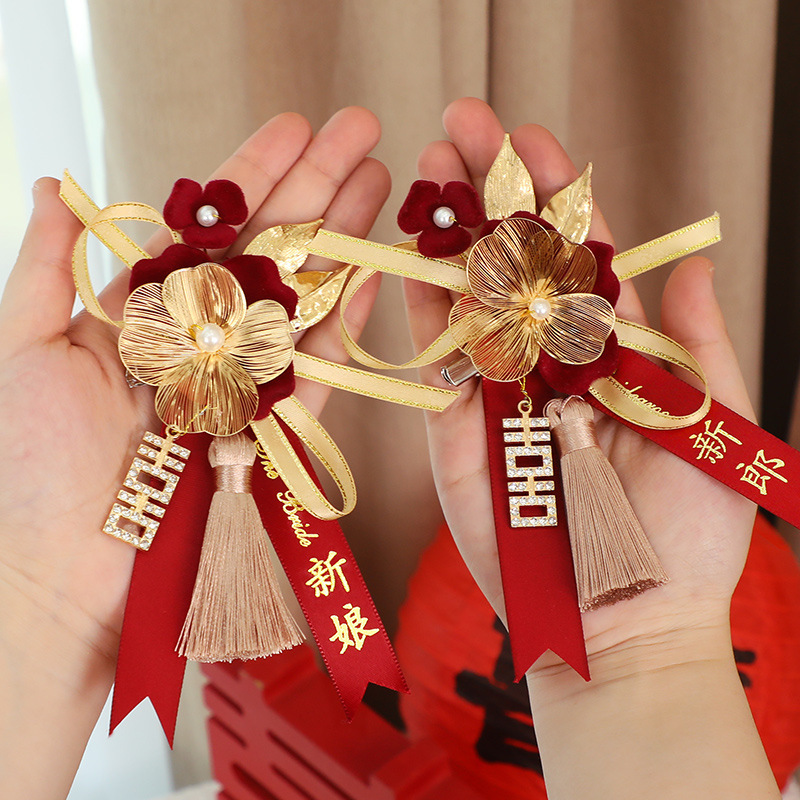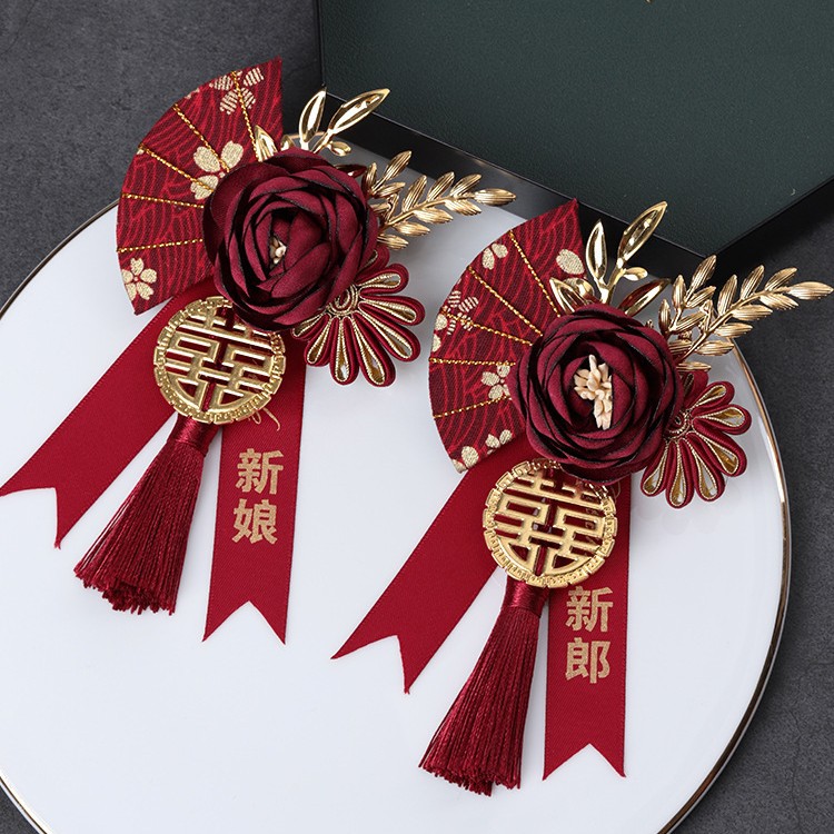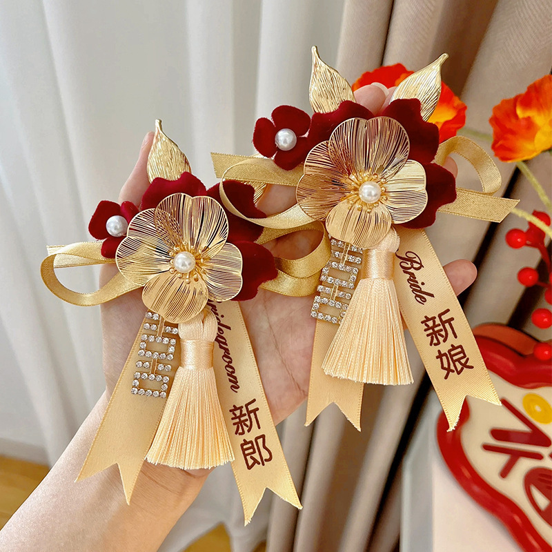 新郎新婦胸花ベルベット高級感装飾花結婚セット家族中国式結婚式両親花嫁ブローチ