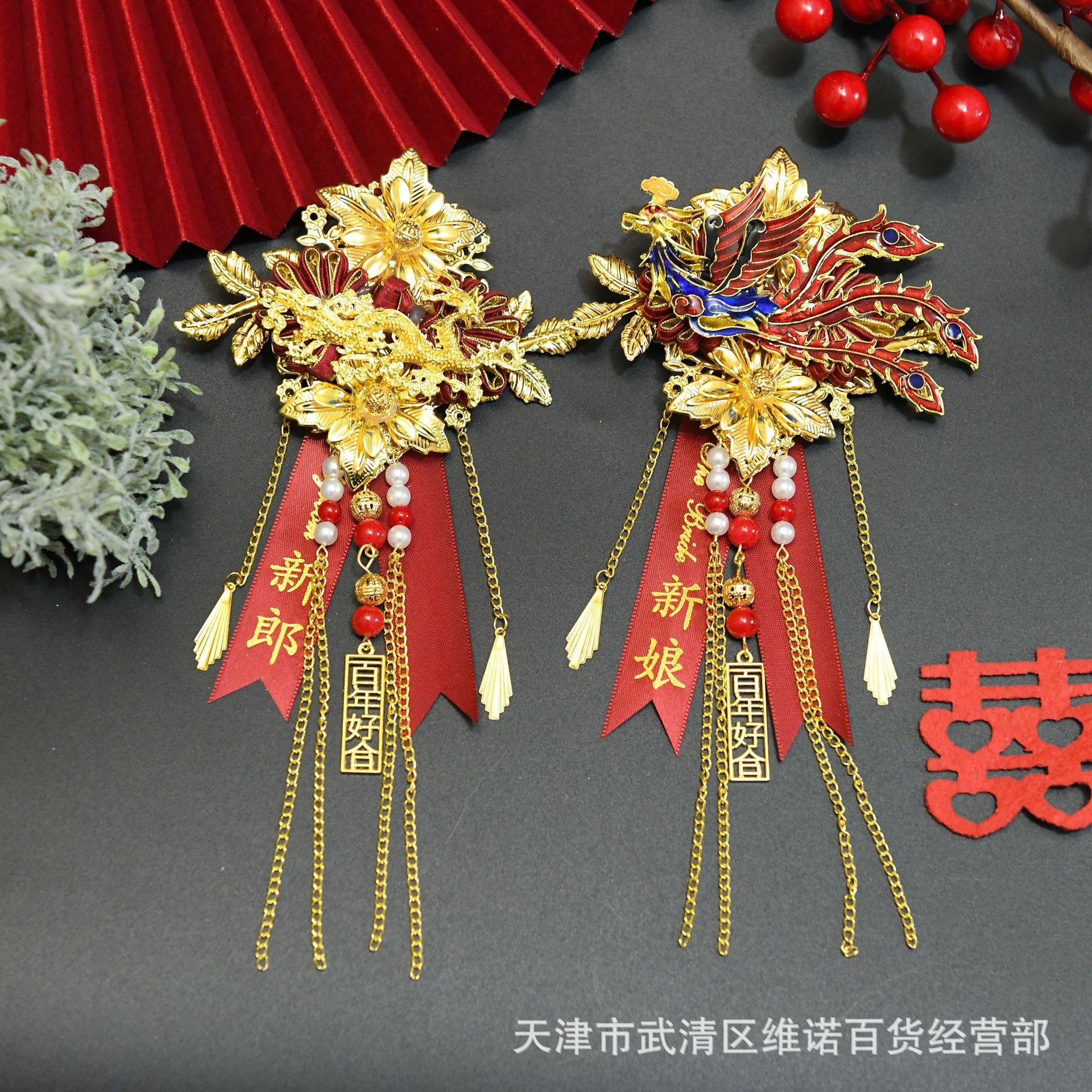 新潮国風新郎新婦結婚胸花結婚式セット家族の両親の磁気吸引襟花秀禾龍鳳羽織金