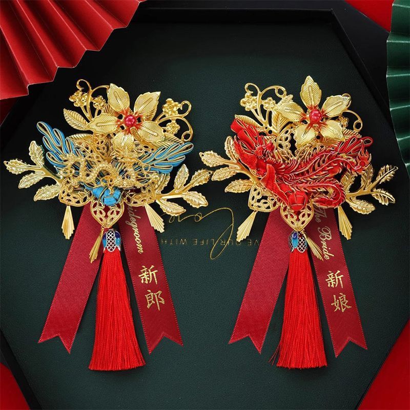 2024豪華版中国式結婚式秀イネ服新郎新婦龍鳳襟花結婚胸花家族セット