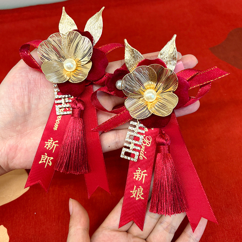 中国式の結婚式の新郎新婦の結婚の胸の花の金色のアイデアのウェディング用品の道具の花嫁の胸の花の卸売り