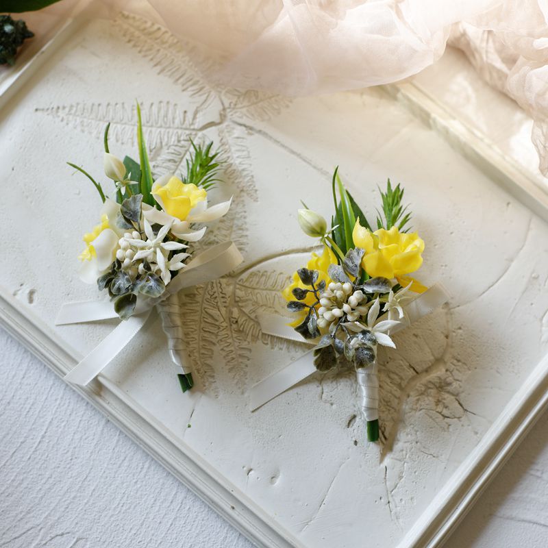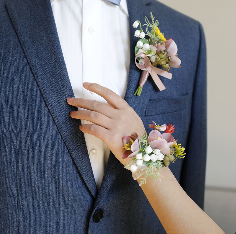 結婚祝いの花芸シミュレーション花ビジネス祝典開業ゲストの胸花結婚新人の襟花姉妹の手首花