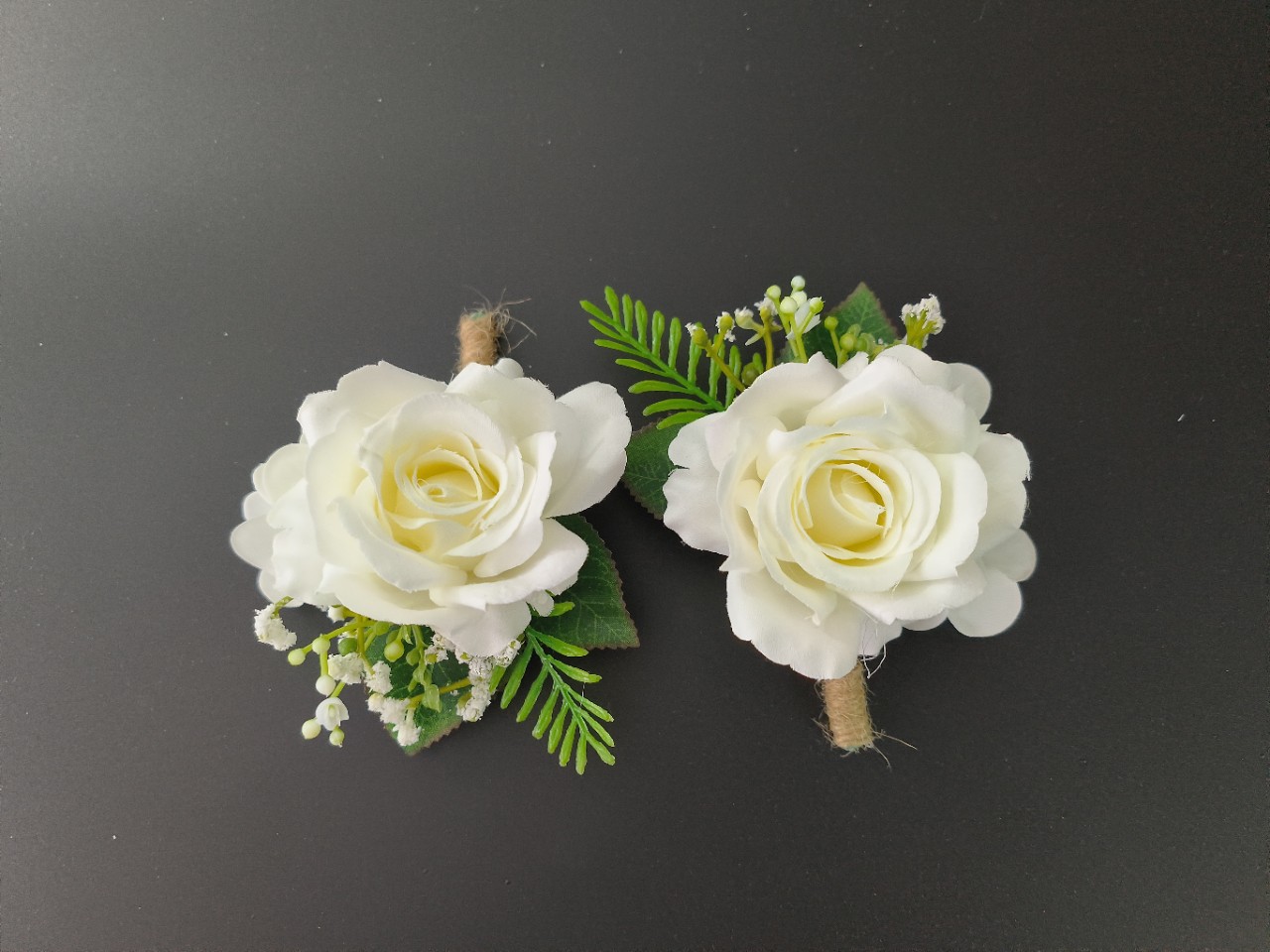 ヨーロッパ式の新郎の胸の花の白いバラのブローチの新婦の手首の花の屋外の結婚式のシミュレーションの花の花嫁の手首の花