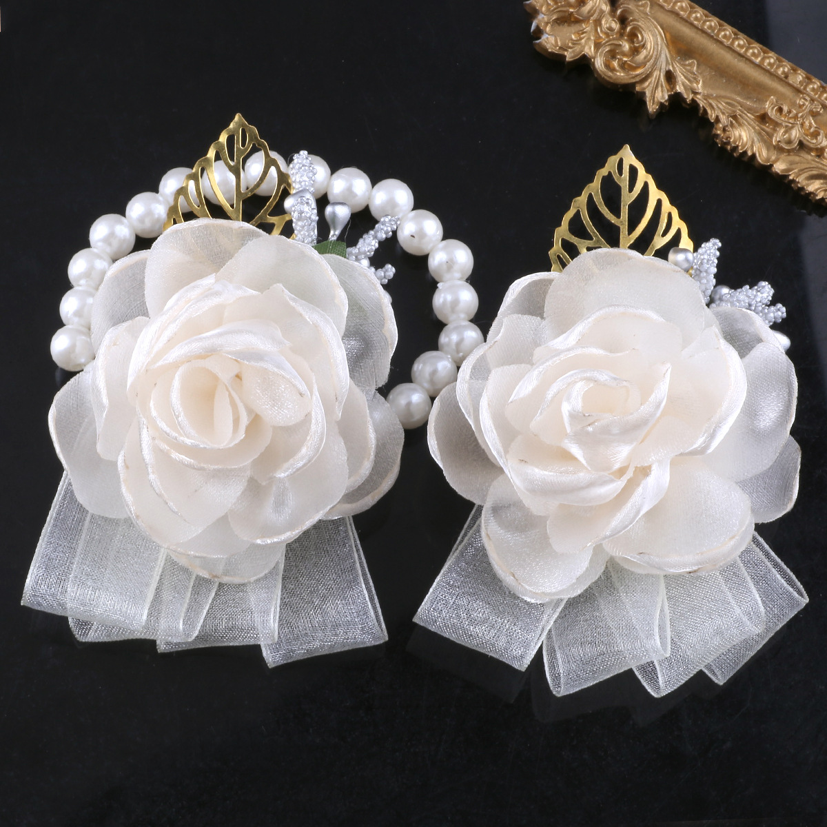 アマゾンの韓国式の花嫁の結婚式の胸の花の手首の花のシミュレーションのバラの花の金の葉の結婚の装飾