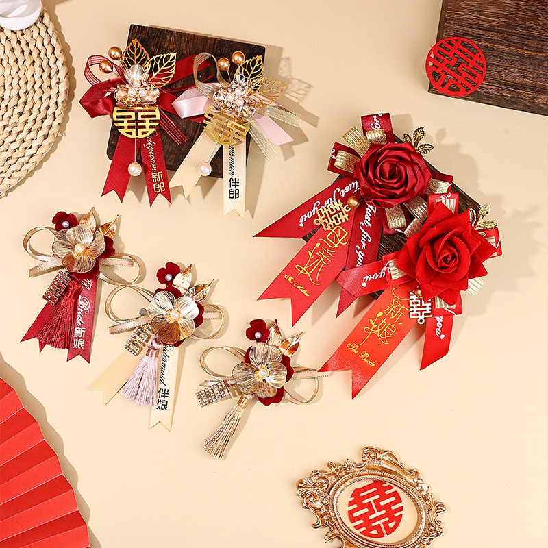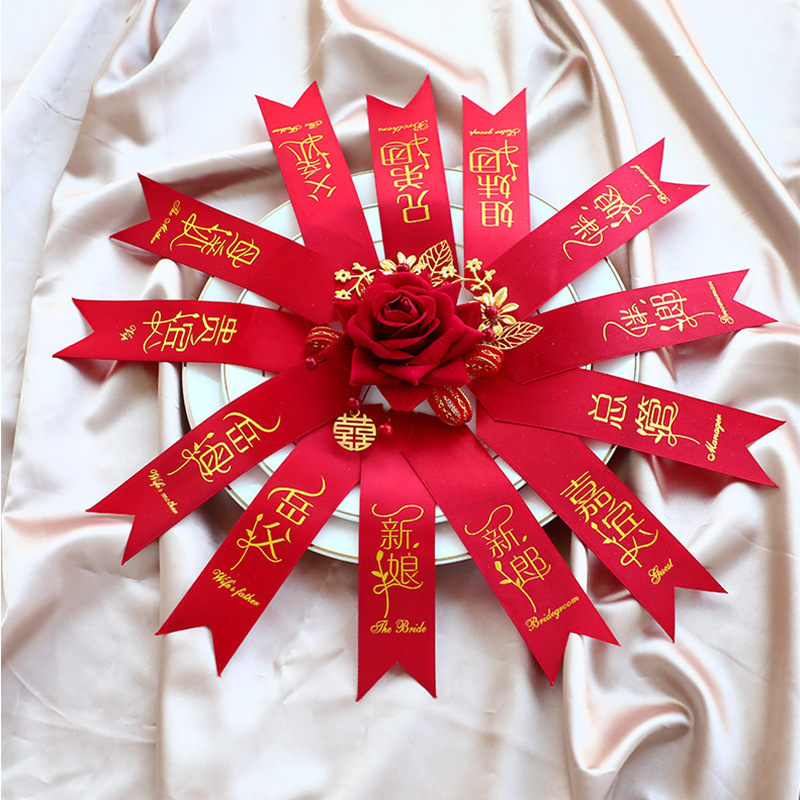 結婚式用呼び称一式 新郎新婦用呼び称布条 中国風胸花リボンメッセージカード卸売 中国風結婚式リボン