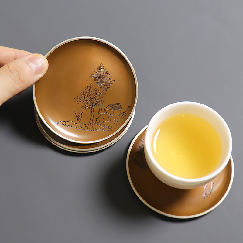 手作り槌目ブロンズティーカップホルダー金属コースター和風火傷防止断熱ティーマット家庭用カンフー茶道アクセサリー
