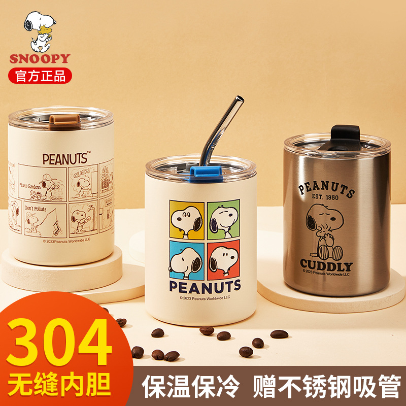 史努比保温杯女生高颜值咖啡杯吸管杯便携随行不锈钢水杯带盖杯子
