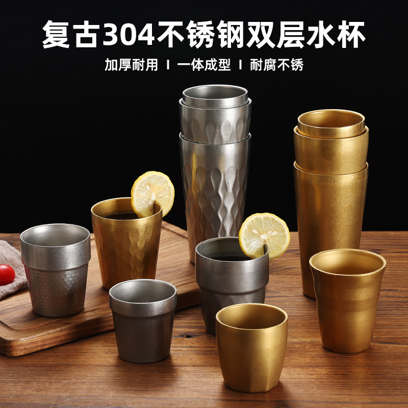 金色304ステンレスコップレトロ古い二重断熱カップレストランティーカップ冷たい飲み物カップジュースミルクカップ
