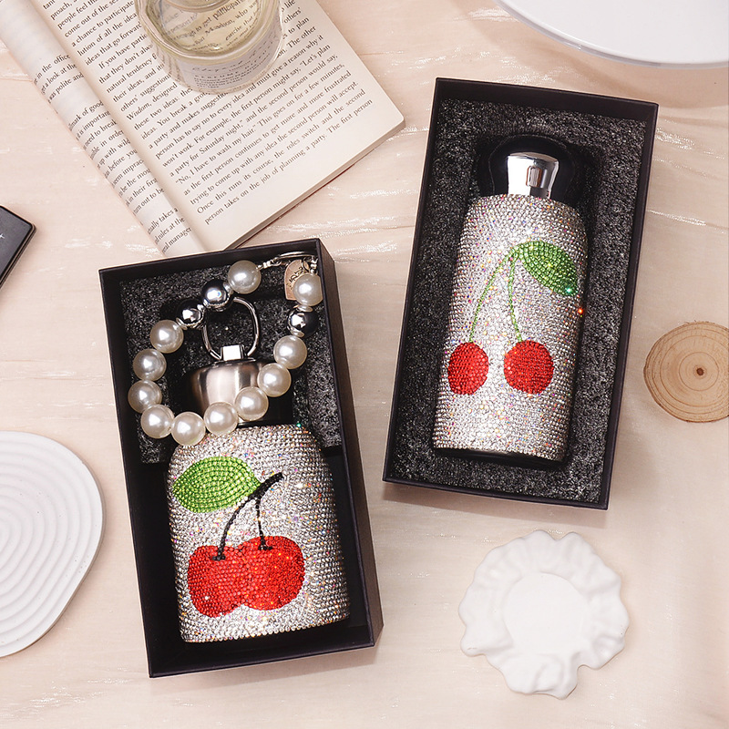 批发便携满钻樱桃保温杯高颜值镶钻大肚杯珍珠手链保温杯圣诞礼物