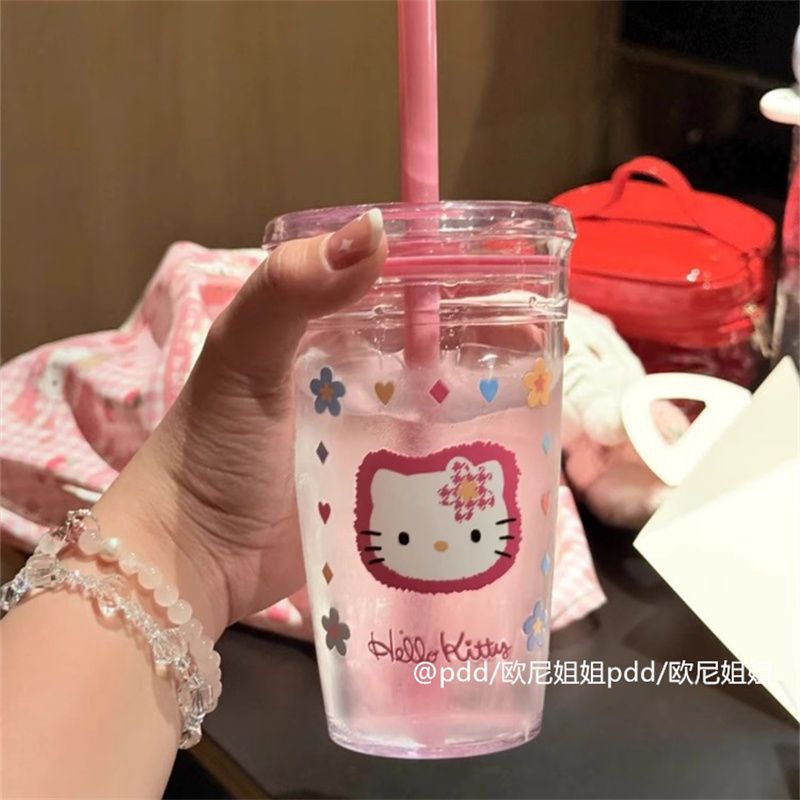 kt凯蒂猫吸管杯女生可爱高颜值水杯便携透明塑料杯学生简约随行杯