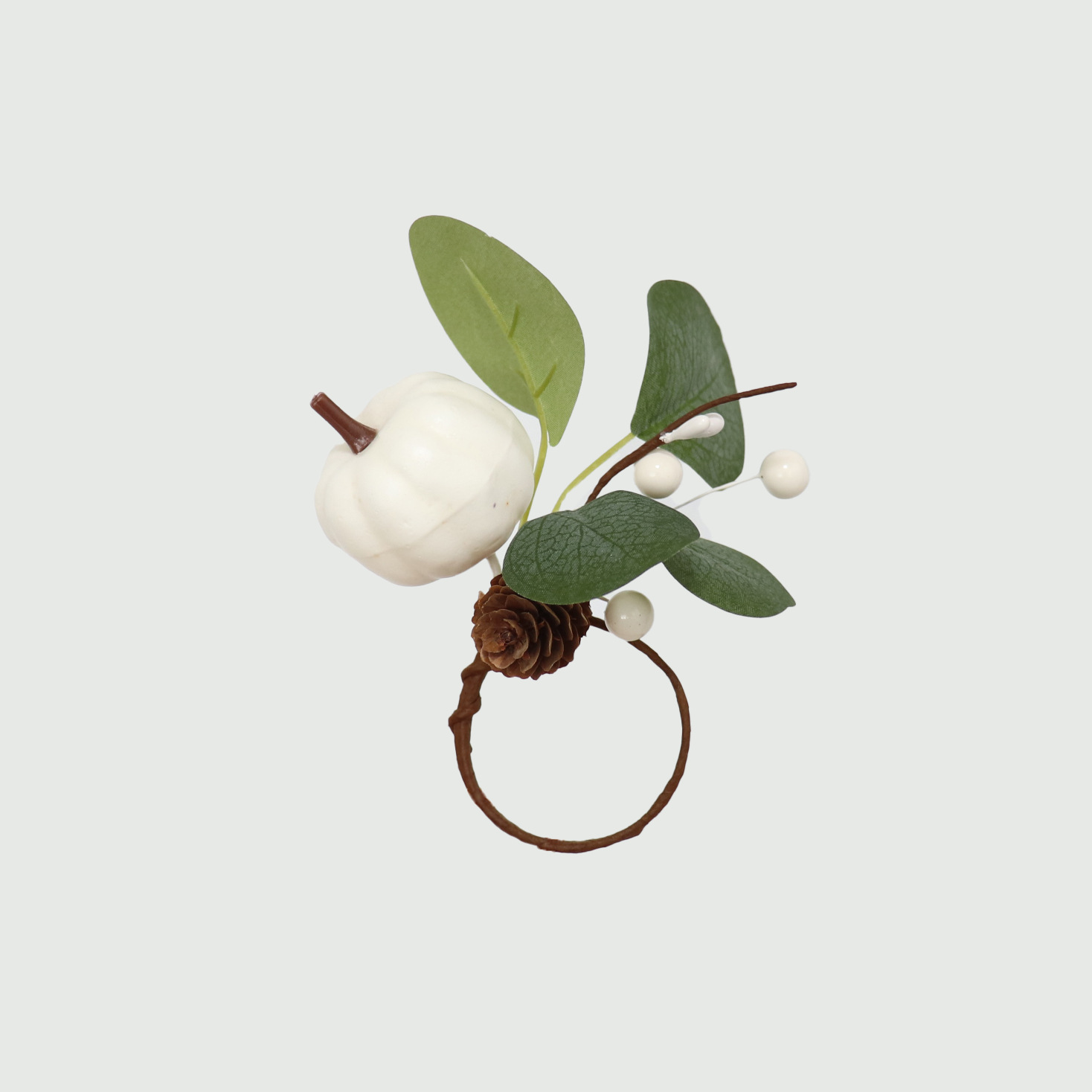 白いカボチャのシミュレーションユーカリの葉のナプキンのリングのナプキンは感謝祭のハロウィンのデスクトップの祝日の装飾の越境して現れます。