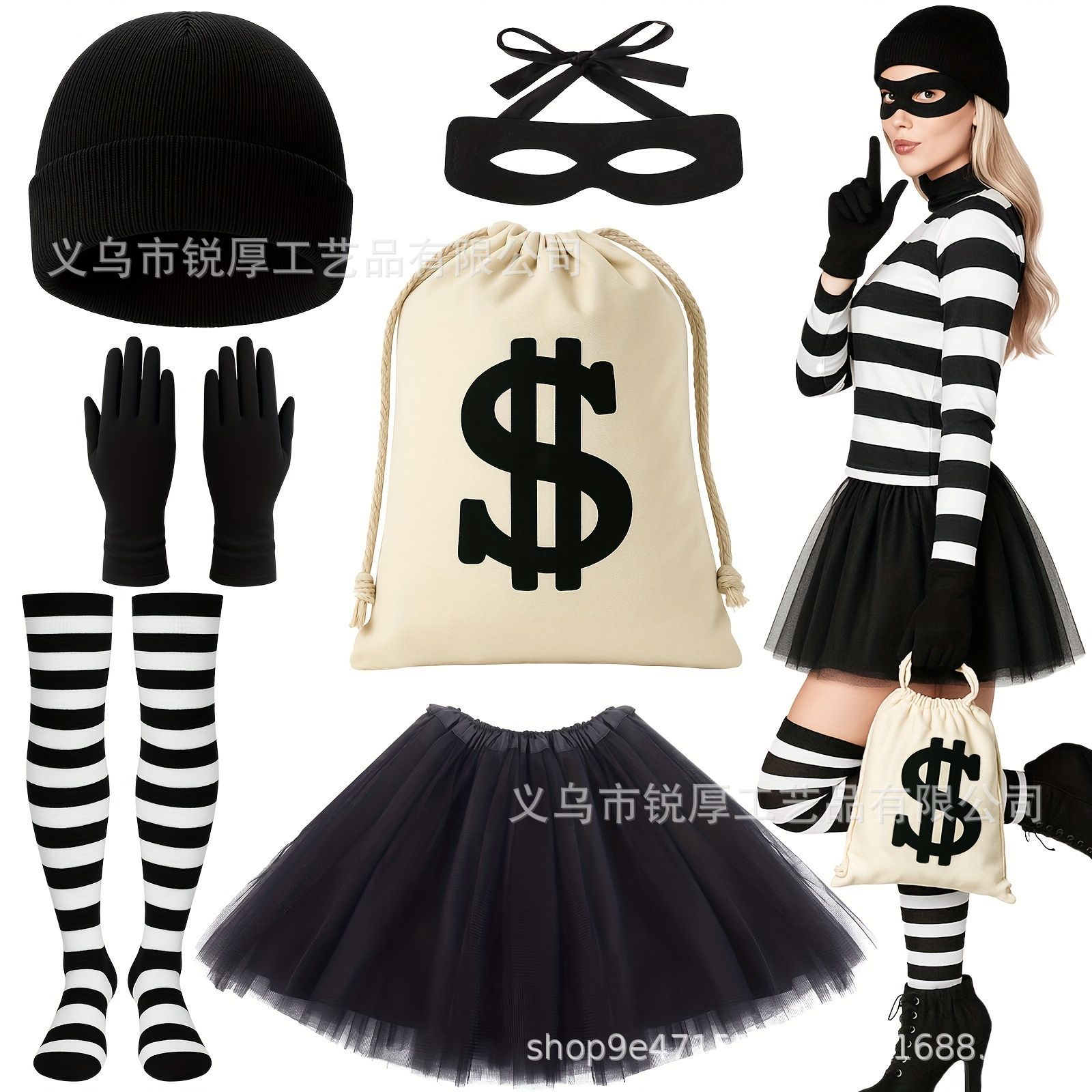 ハロウィン cos 泥棒スーツドルキャンバスバッグストッキング黒ニット帽黒手袋アイマスクセット