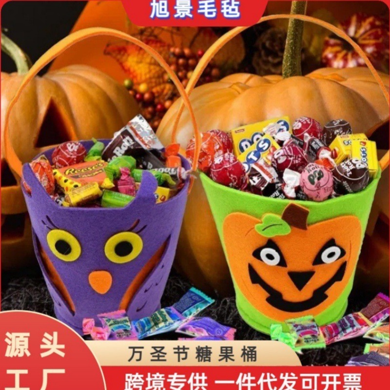 国境を越えたハロウィーンの子供のキャンディー袋のフェルトの桶は取っ手の街頭のお菓子を持って幽霊のコウモリのクモのカボチャを包みます。
