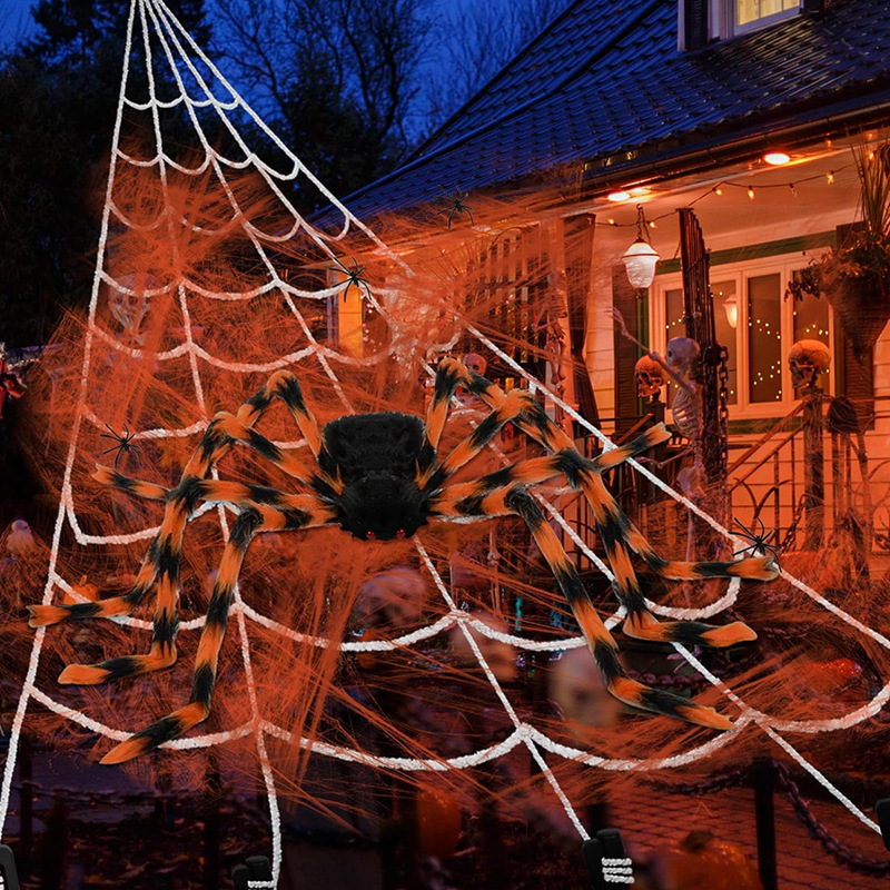 ハロウィーン装飾カラーぬいぐるみ屋外庭園のお化け屋敷は、大きなクモのシーンをシミュレートして道具を配置する