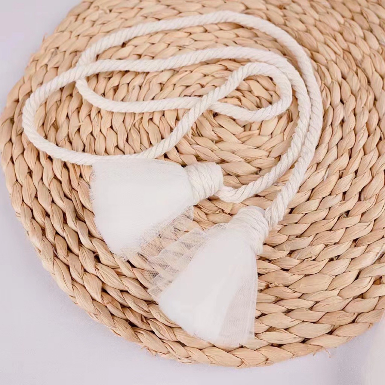メーカーのカーテンはシンプルな綿のひもで縛られています。