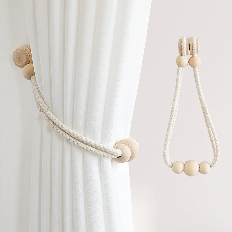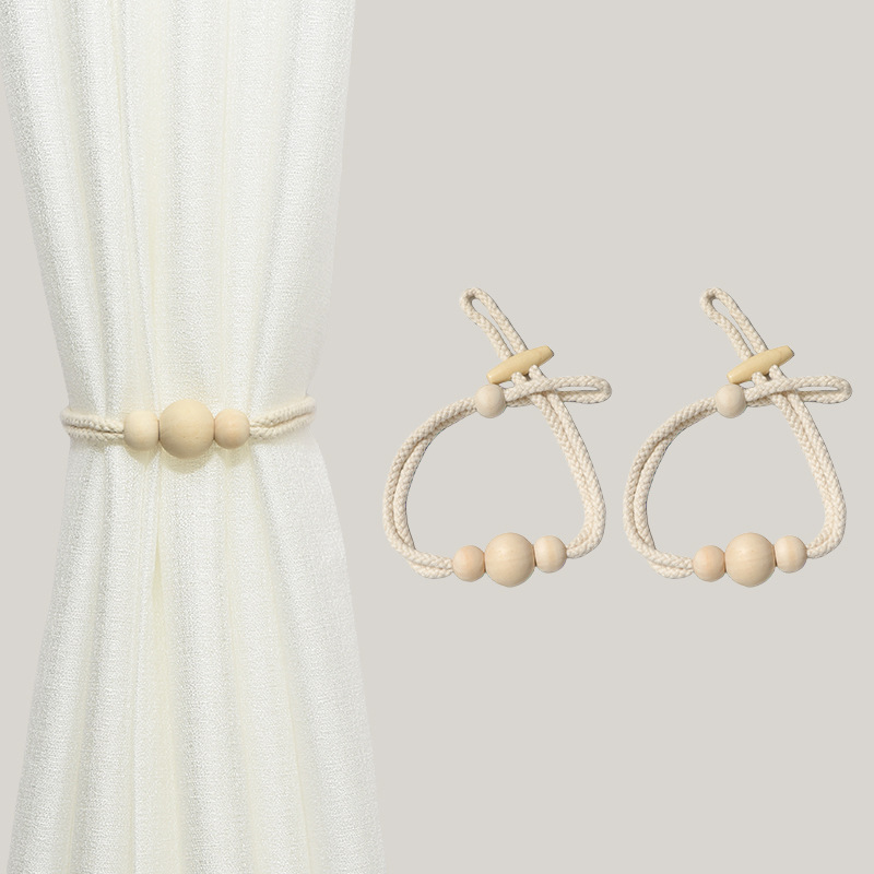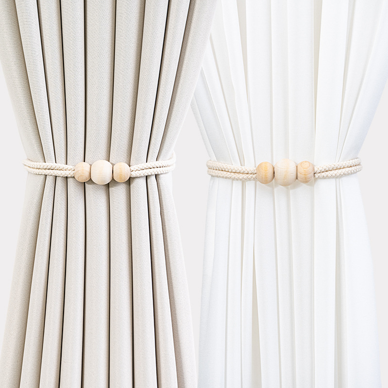 木製ビーズカーテンストラップ、手作り綿ロープストラップのペア、モダンなシンプルなガーゼカーテン収納固定カーテンストラップ