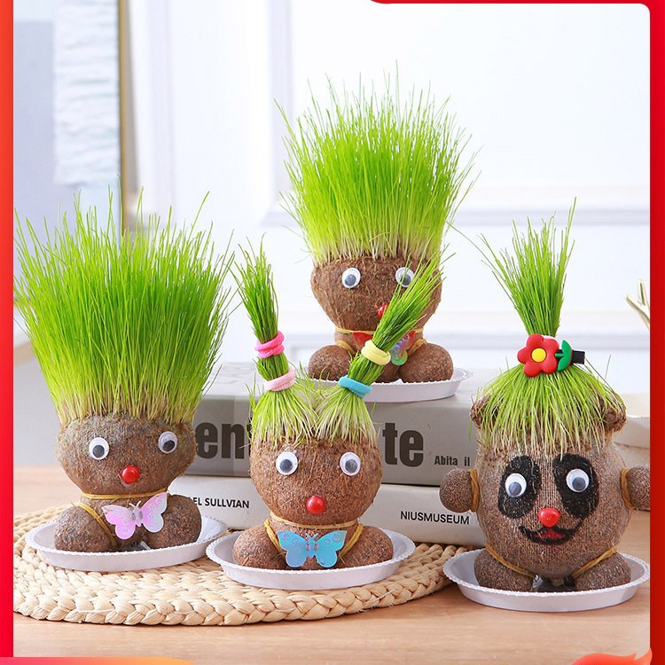 頭に草が生える人形、緑の植物、デスクトップ水耕栽培、子供に適した草植物、幼稚園の鉢植えの小さな装飾品