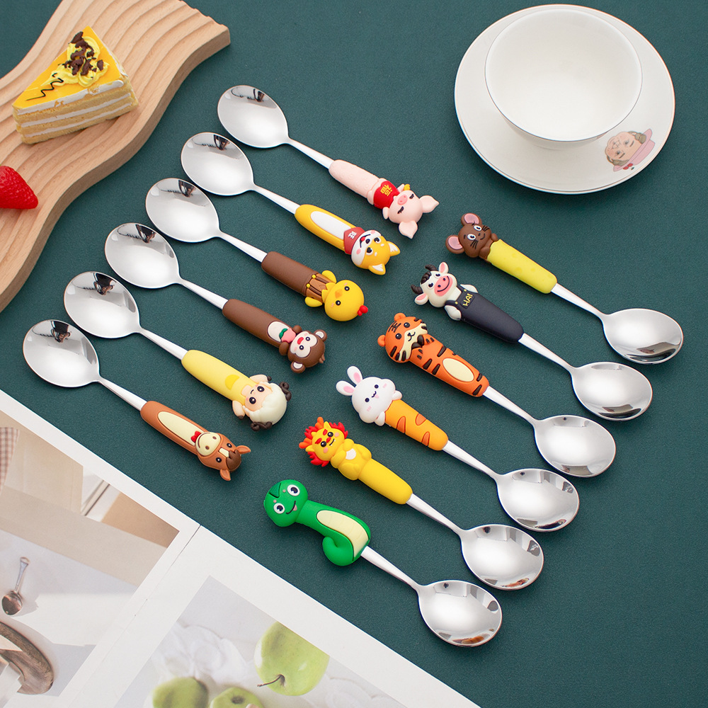410 ステンレス鋼デザートスプーン食器セット PVC ビッグ人形ハンドル干支シリーズシルバーコーヒースプーン