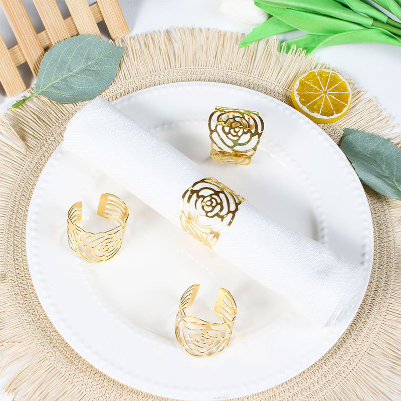 卸売りレストランホテルの開口バラのナプキンリングのシンプルな金属ナプキンのボタン