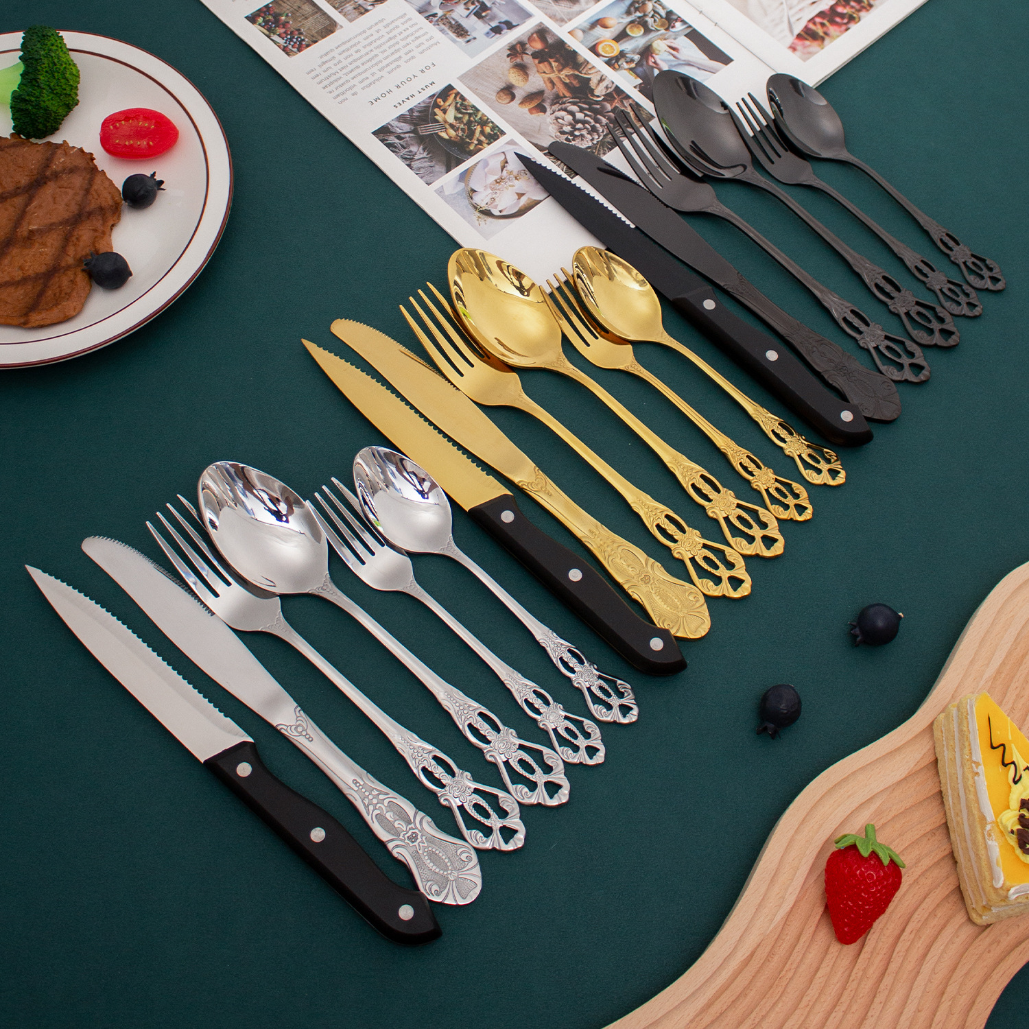 クロスボーダーのレトロな透かし彫りの皇庭はステンレスの洋食の食器のステーキナイフの24/48件のセットの飛行機の箱を設計します。