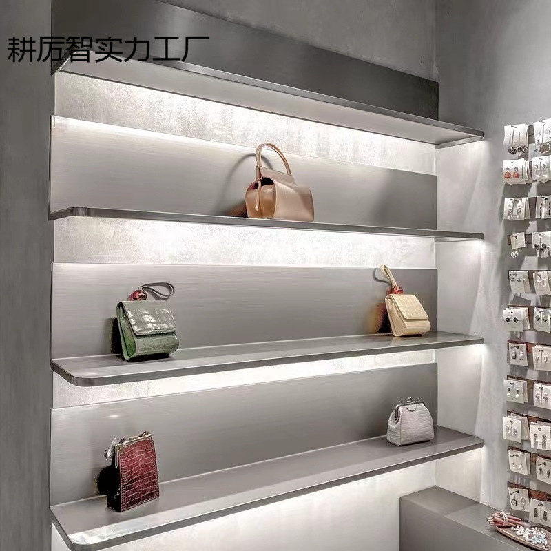 衣料品店のディスプレイラックステンレス鋼つや消しディスプレイラック婦人服店の壁パーティション収納ラック靴バッグコートと帽子