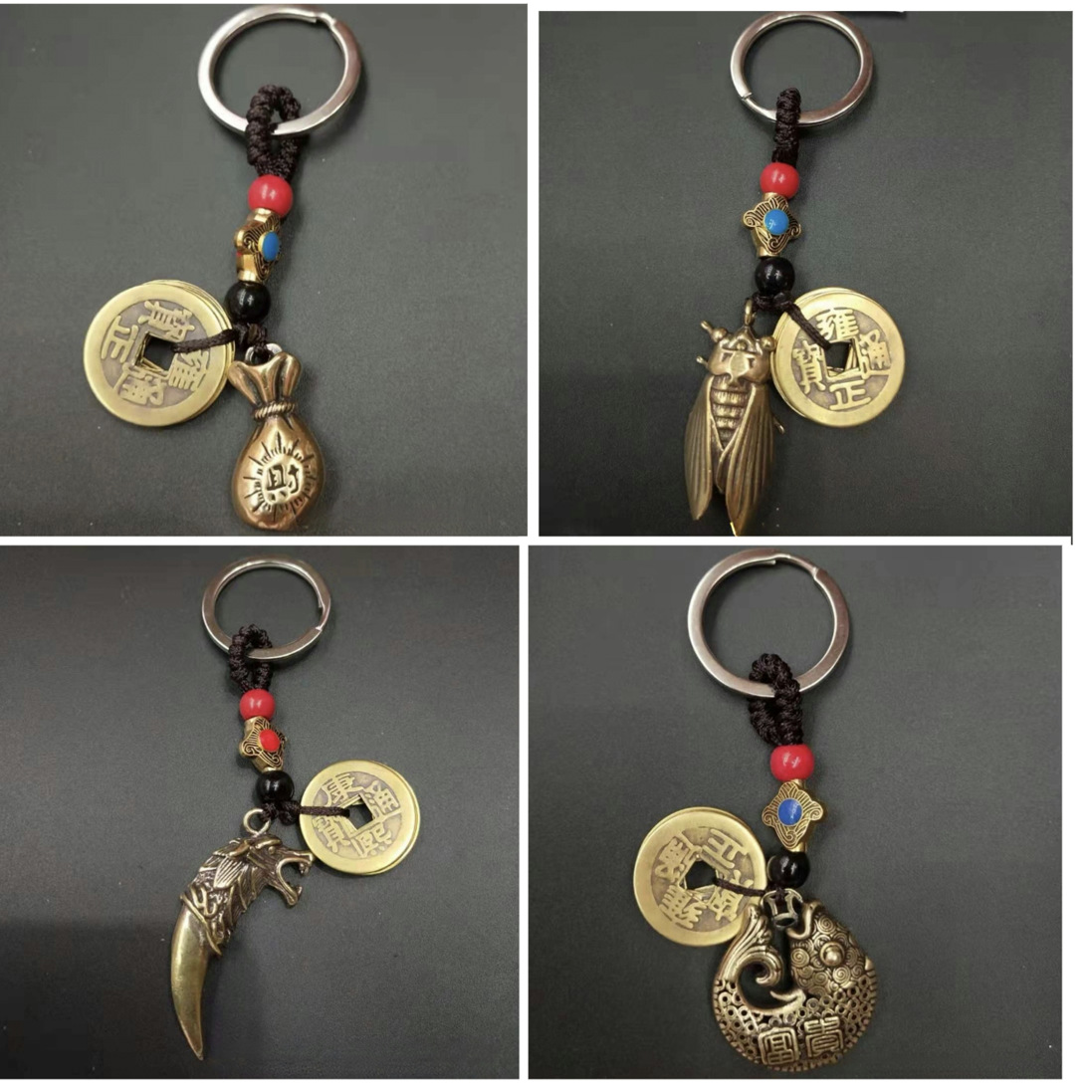 真鍮のキーホルダーを卸売りして、手作りのアクセサリーの小さい商品のレトロな銅の鈴の五帝のお金の十二生肖のペンダントを掛けます。
