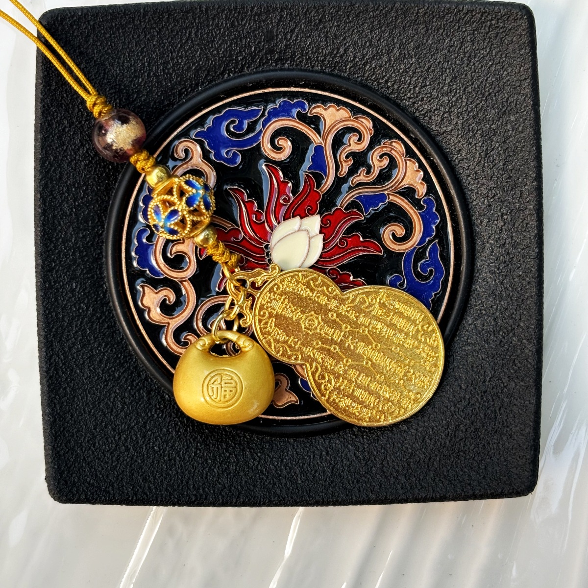 平安如意本命年黄金色のキーホルダーに紐を掛けます。