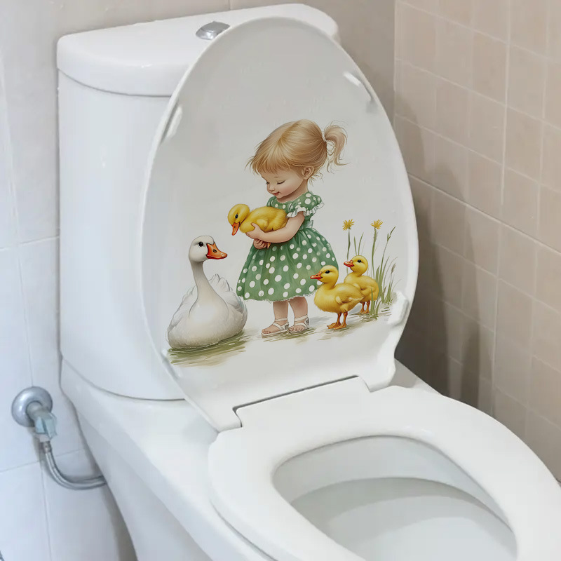 小さなアヒルと小さな白いガチョウを抱いた小さな女の子がトイレのステッカーで遊んでいる新しいPVCステッカー家の装飾用