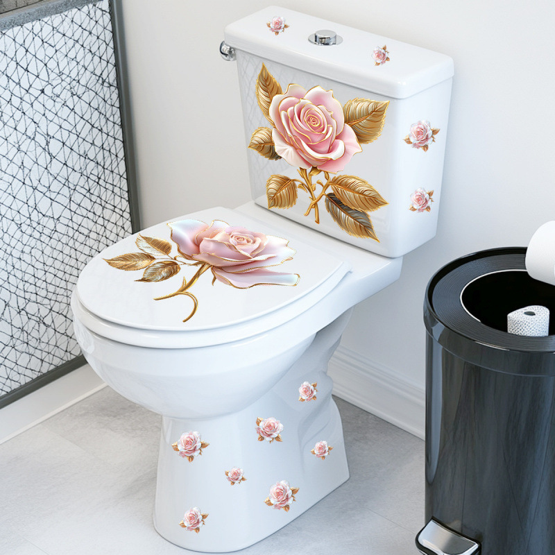 模擬ピンクのバラの花と金の葉のトイレステッカー浴室トイレ装飾ステッカー新鮮な花の壁のステッカー