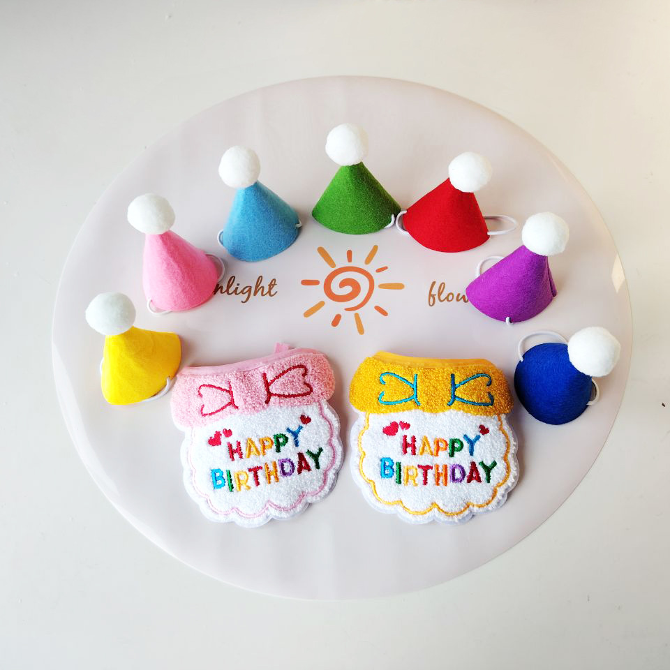 ペットハッピーバースデーよだれかけ帽子セットレース刺繍猫と子犬韓国のかわいい唾液タオルヘッドアクセサリー
