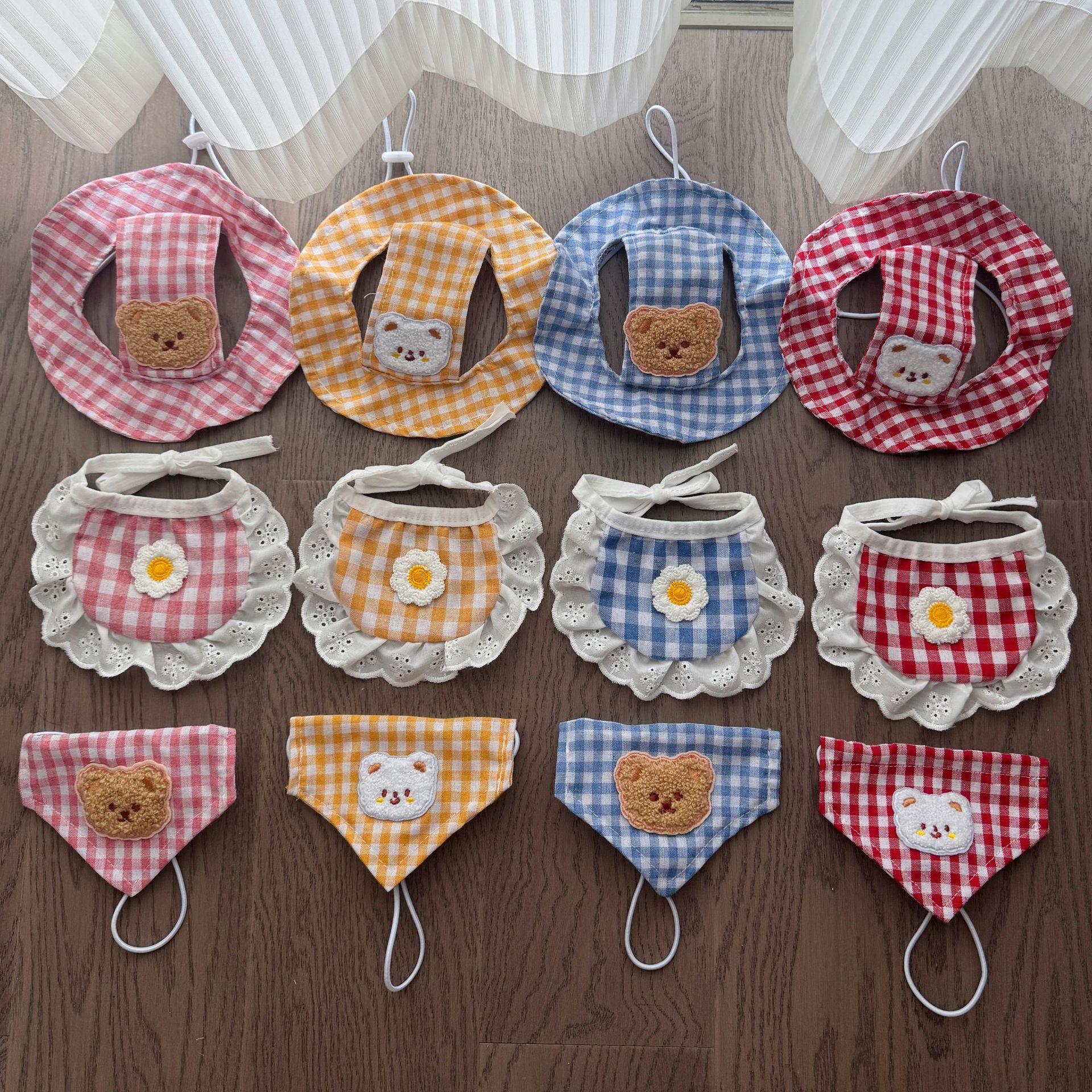 ペット帽子スカーフセット 20 センチメートル人形ヘッドギアよだれかけチェック柄小花猫犬唾液タオルよだれかけ