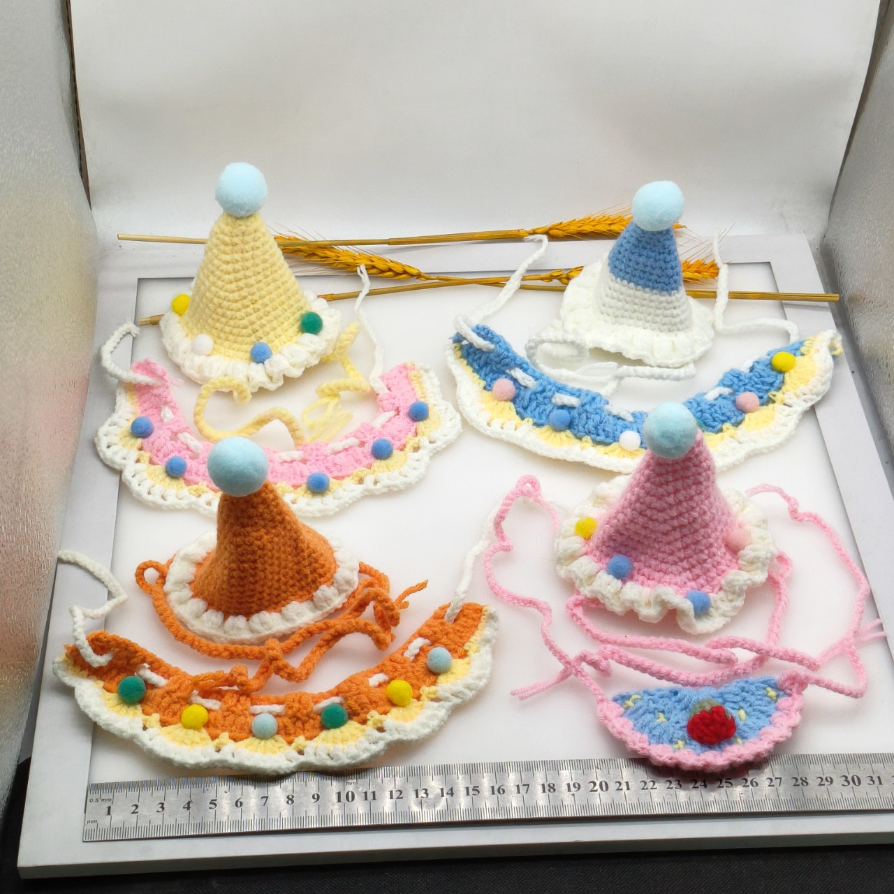 手作りのかぎ針編み猫の誕生日帽子ペットの帽子かわいい猫の首輪子犬編みよだれタオル DIY アクセサリー