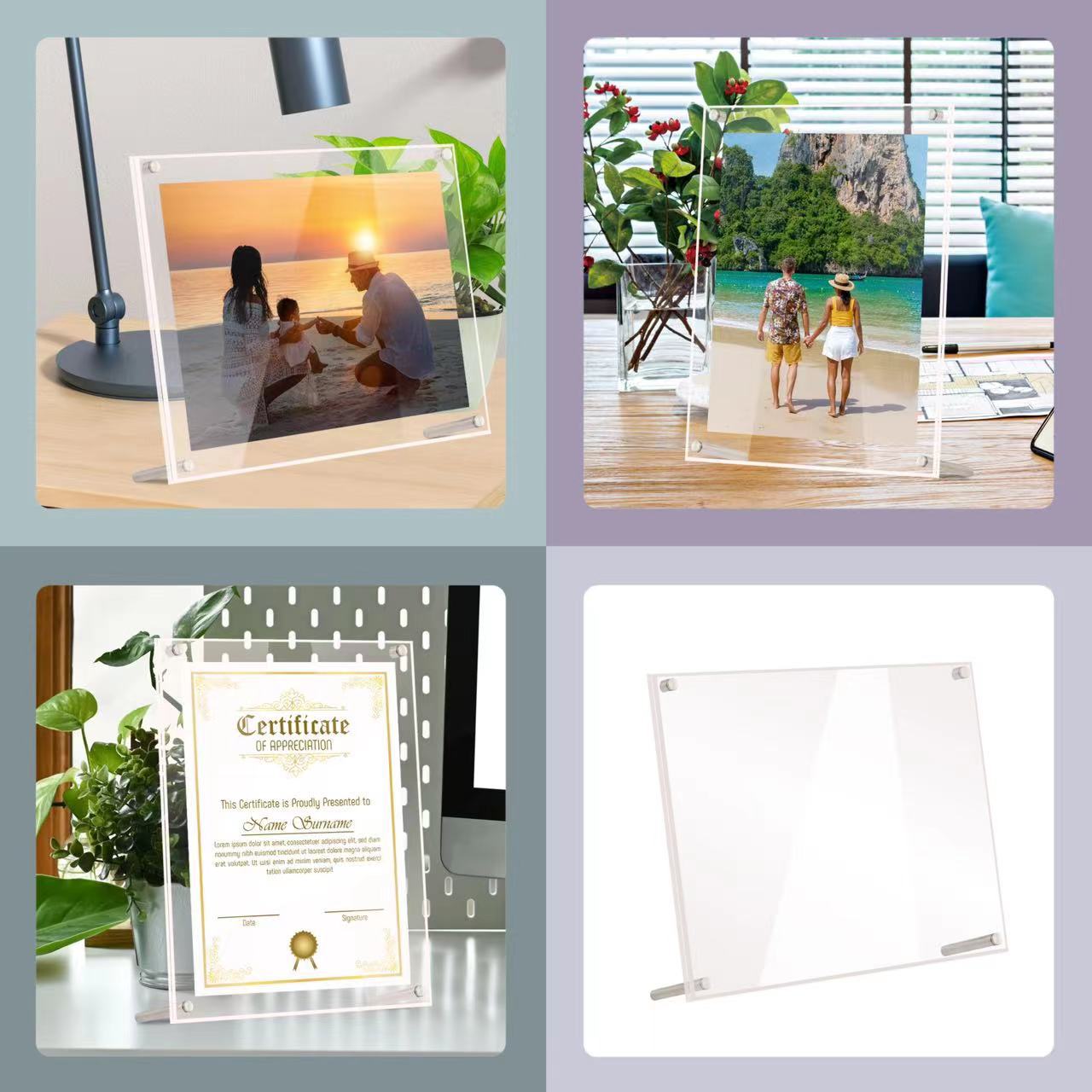 Bt092立体二重透明アクリルフォトフレーム写真証明書クリップ金属スタンド置き台空白メモ帳