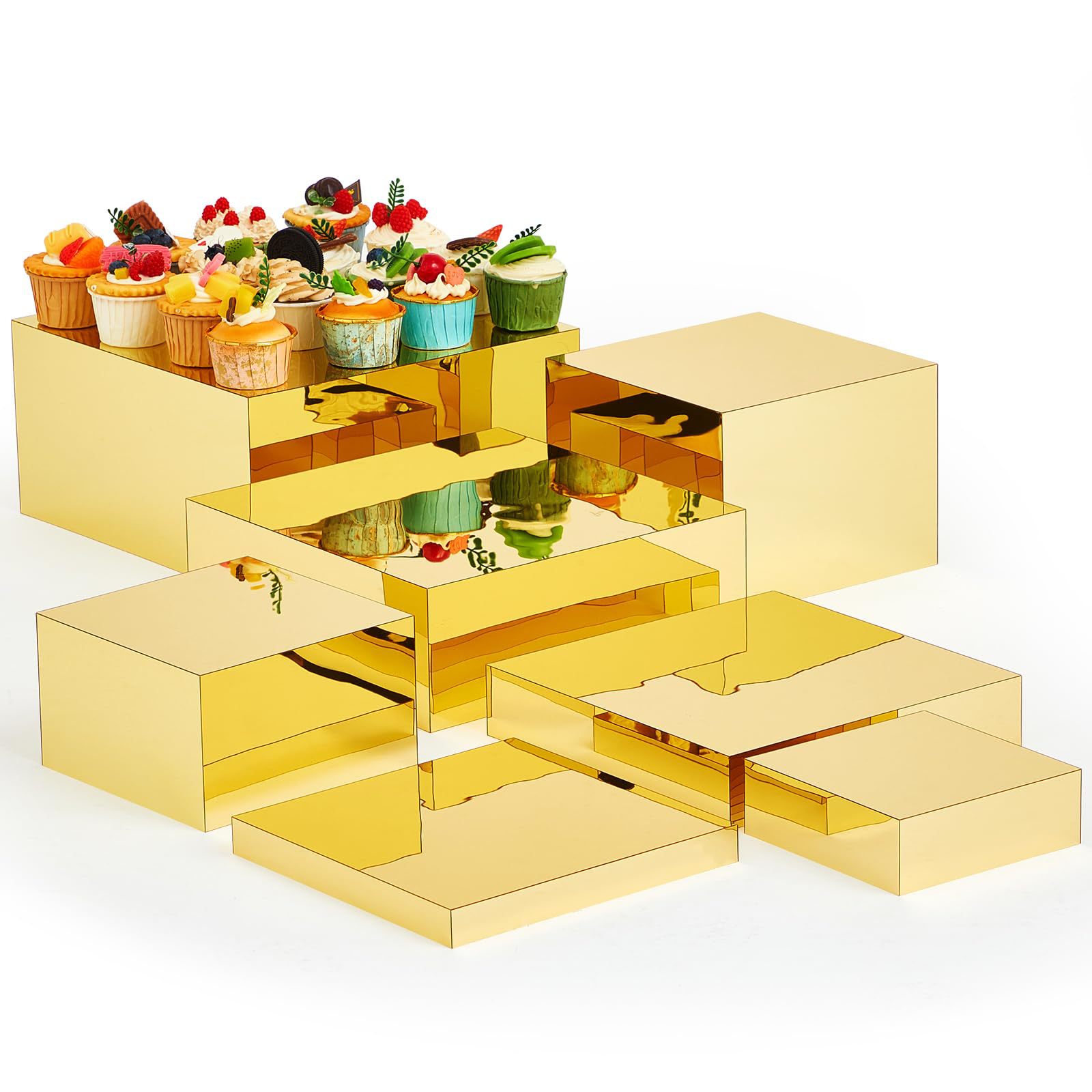 7個のゴールドディスプレイスタンドキューブボックス、中空底象嵌アクリルホルダー付き、ウェディングパーティーに最適