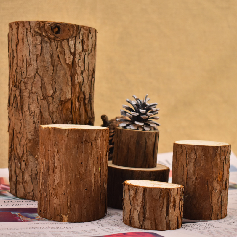 小さな杭のベースに木の杭の元の木の杉の木を飾って写真を撮って手作りの装飾道具を展示します。