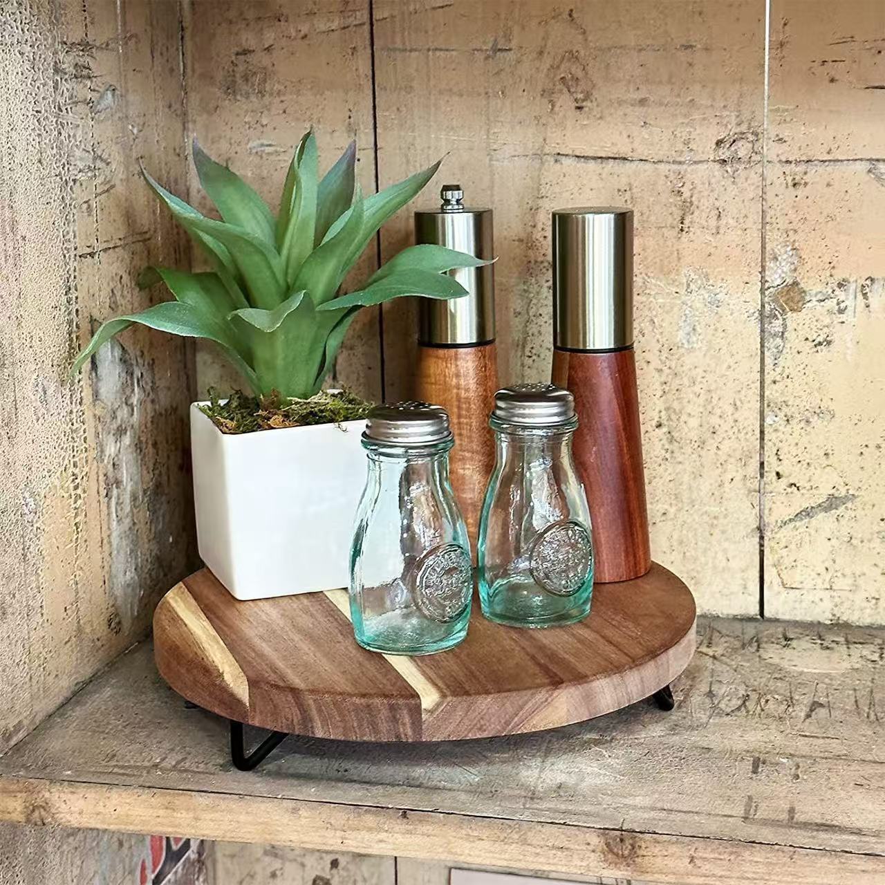 アカシアの木の丸いベースのスタンドのデスクの香薫の緑の植木鉢の棚のデスクの装飾のベースの浴室の収納のトレー