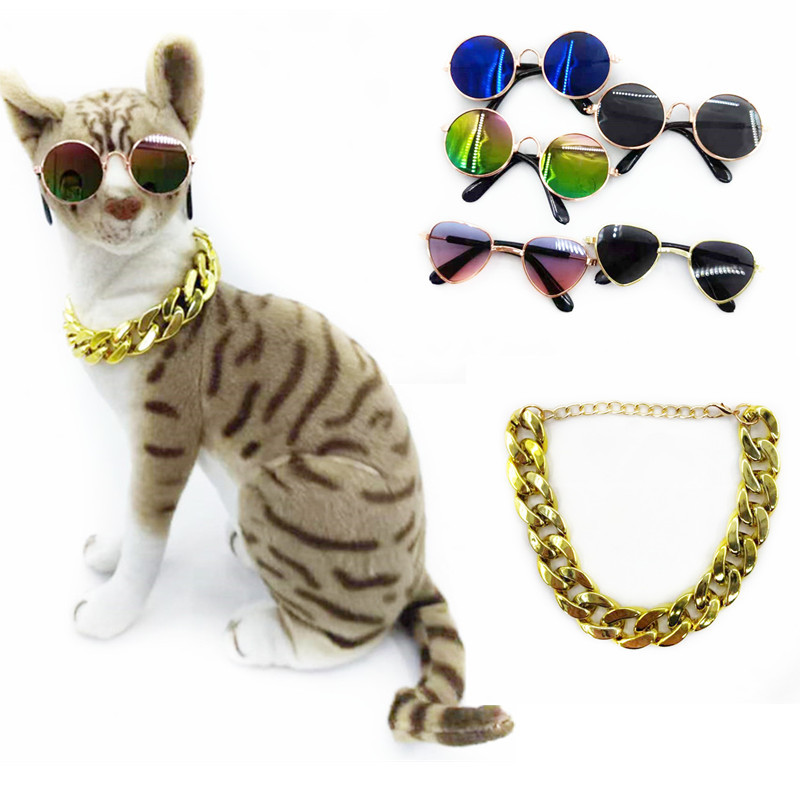 Wish越境ペットメガネ金首輪猫テディサングラス大金ネックレスセット犬覇気金チェーン