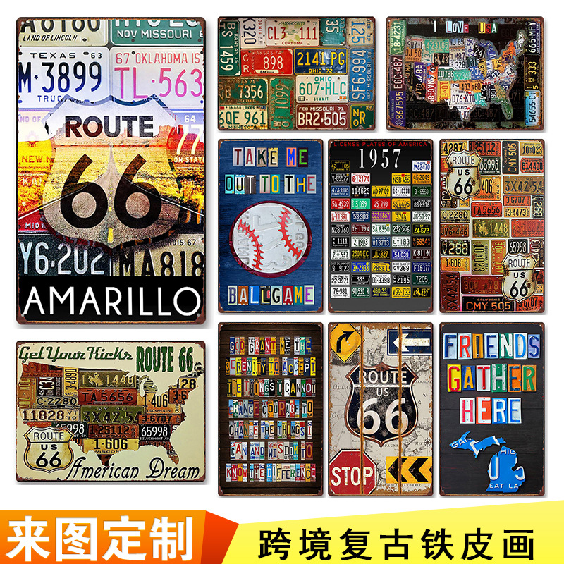 国境を越えたレトロな鉄皮装飾画コーヒー鉄皮画壁牌喫茶店客間壁面ブリキナンバープレート掛け画